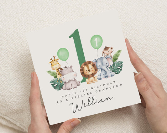 Celebrate a special little one's first birthday with this adorable personalised safari animal card, featuring...