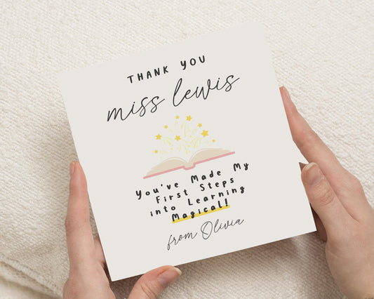 Show your appreciation with this personalised thank you card for teachers, featuring a magical book...