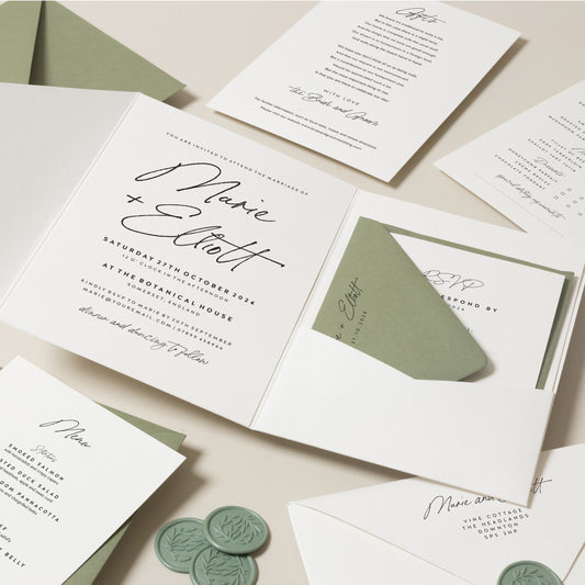White And Green Elegant Pocketfold Wedding Invitation Set 'Marie'