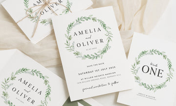 Our beautiful and bold greenery in which accompanies the Amelia design is the perfect accent to any wedding day! The entire wedding stationery collection has wreaths of olive leaves in a pastel green, a match made in heaven to sage themes! The collection includes save the dates, invitations, welcome signs and much much more to tie the whole day together, because we know just how much the finishing details matter!