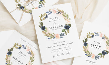 Florals provide elegance to your wedding day! Our Elise wedding stationery collection encompasses gorgeous colours with blue, pinks and greens! A colourful wreath around your table numbers and a boarder for your place cards they do give beautiful details to your wedding accents! Inspire guests with floral invites and give them a hint to the big day to come!