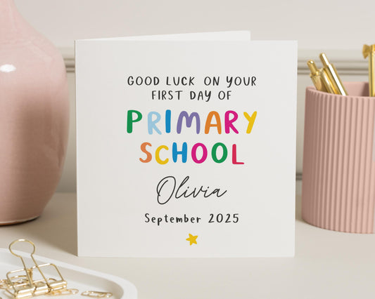 Wish them luck on their first day of primary school with this colourful, personalised card....