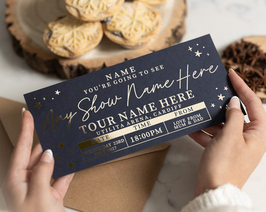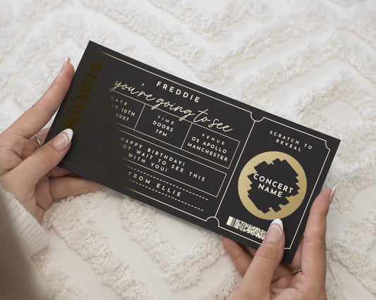 Surprise someone with a personalised concert ticket gift voucher. Featuring gold foil and a scratch...