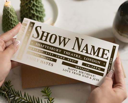 A luxurious gold foil personalised theatre ticket gift voucher, perfect for birthdays and special occasions....