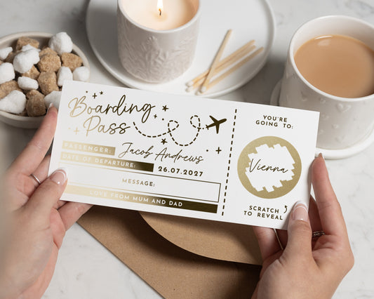 Surprise someone special with a personalised gold foil boarding pass gift voucher. Features a scratch...