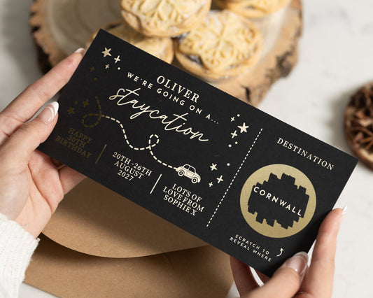 Surprise someone special with a personalised staycation gift voucher. Featuring gold foil on a black...
