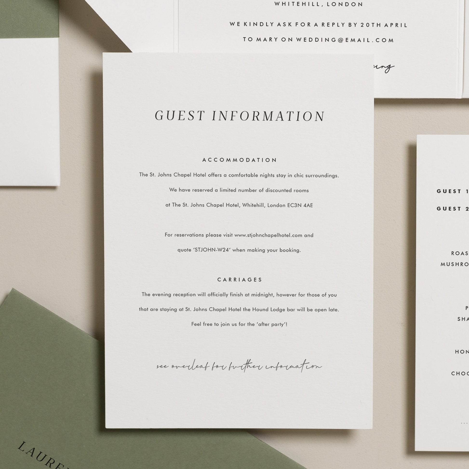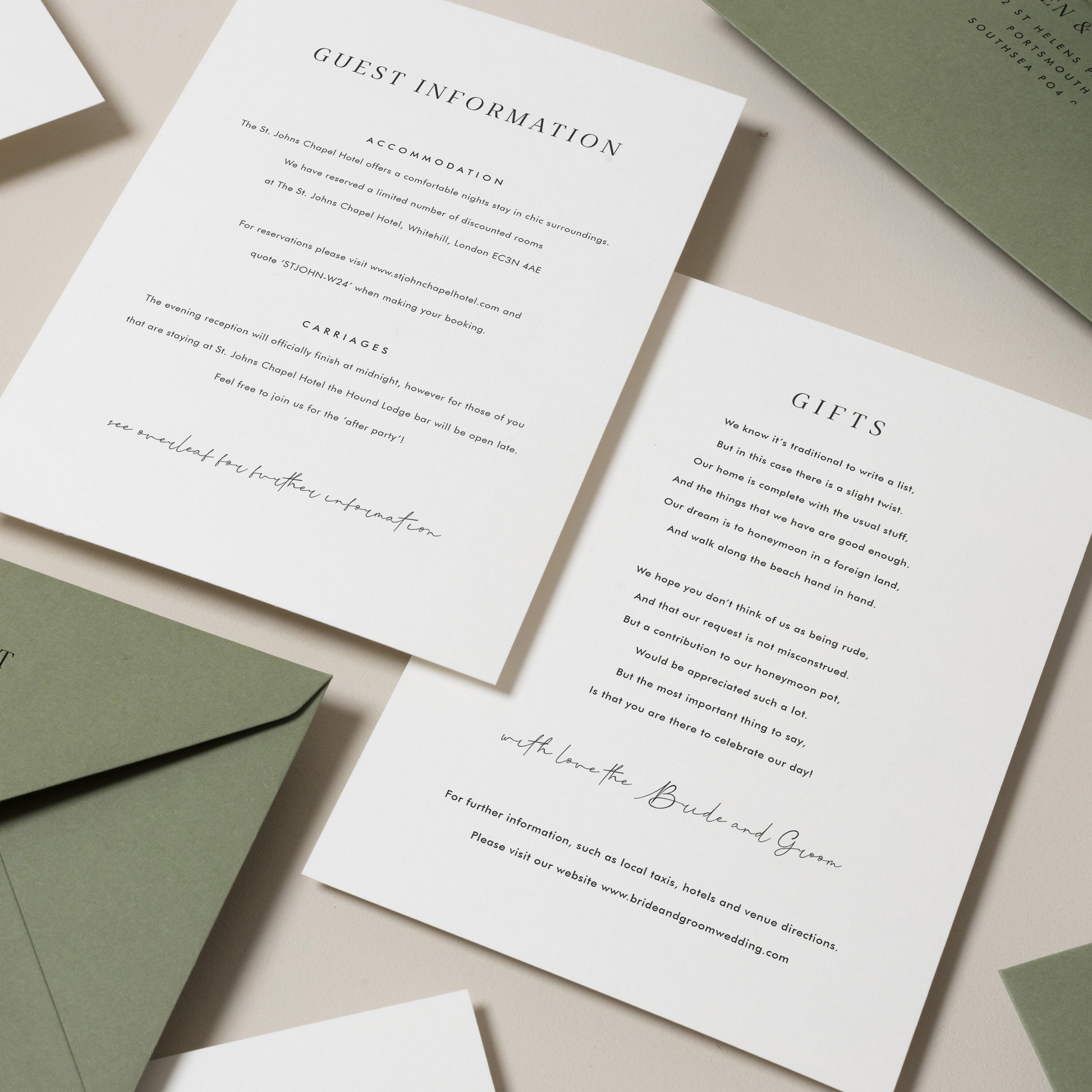 INFO CARDS: Useful for additional info such as taxi numbers, hotels, gift lists, poem's and more.