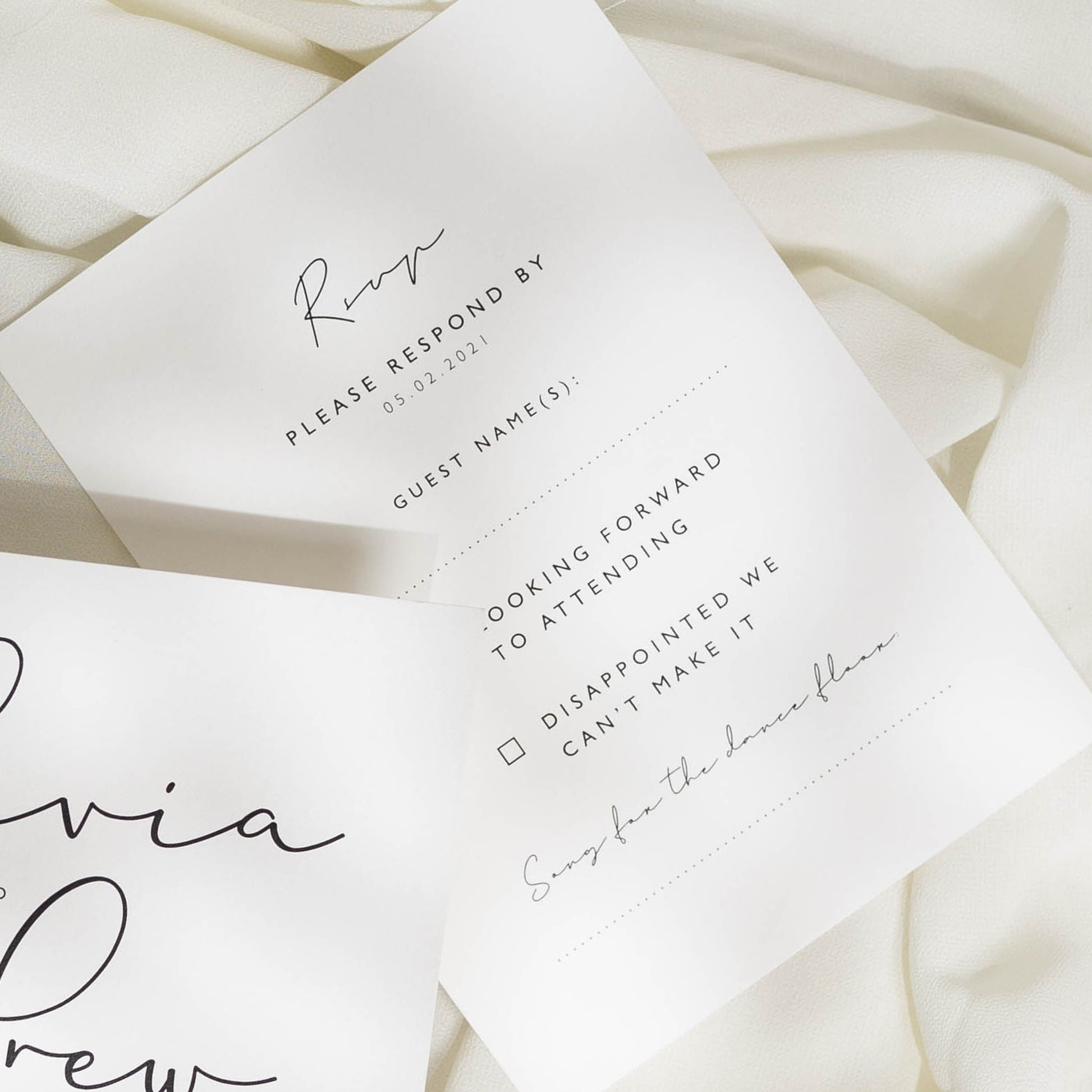 RSVPS: Choose one sided for a simple yes/no response or both sides for menu choices.