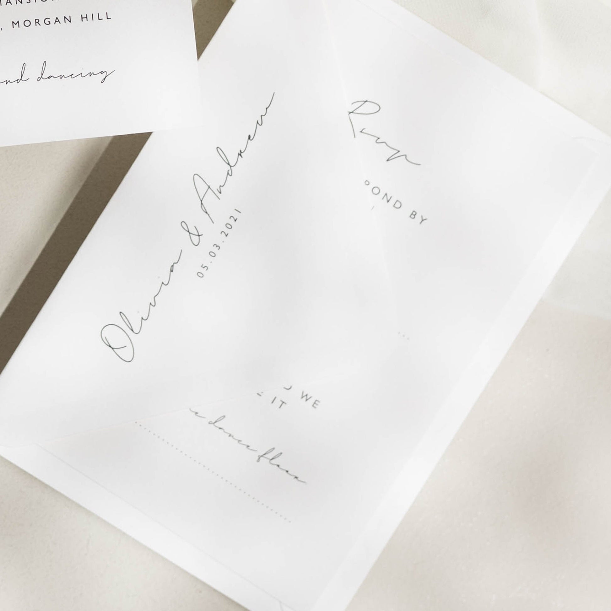 VELLUM JACKETS: Our translucent vellum jackets wrap around your invitations to add interest, texture and intrigue.
