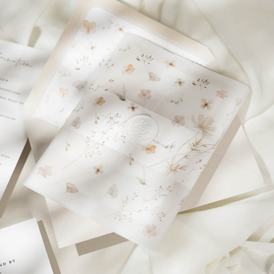 VELLUM JACKETS: Our translucent vellum jackets wrap around your invitations to add interest, texture and intrigue.