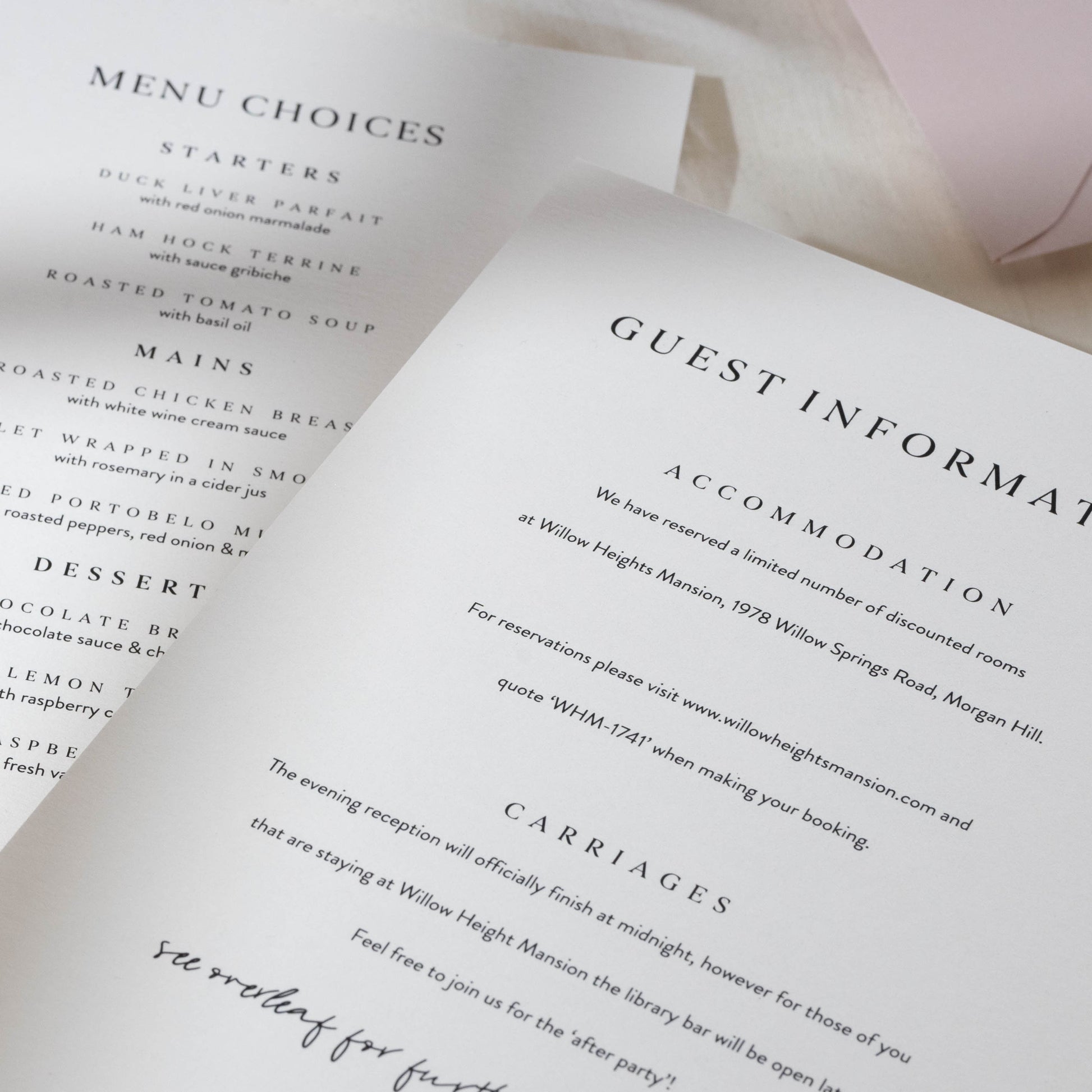 INFO CARDS: Useful for additional info such as taxi numbers, hotels, gift lists, poem's and more.