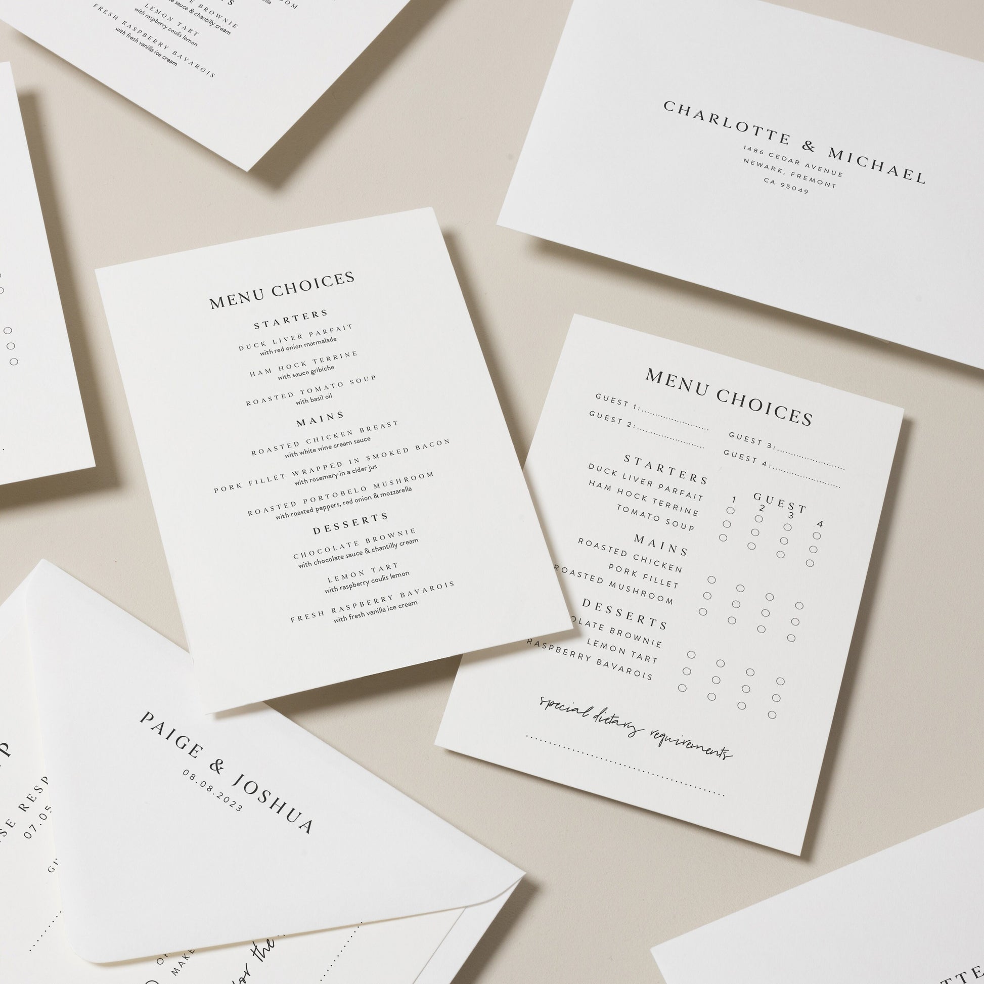 RSVPS: Choose one sided for a simple yes/no response or both sides for menu choices.
