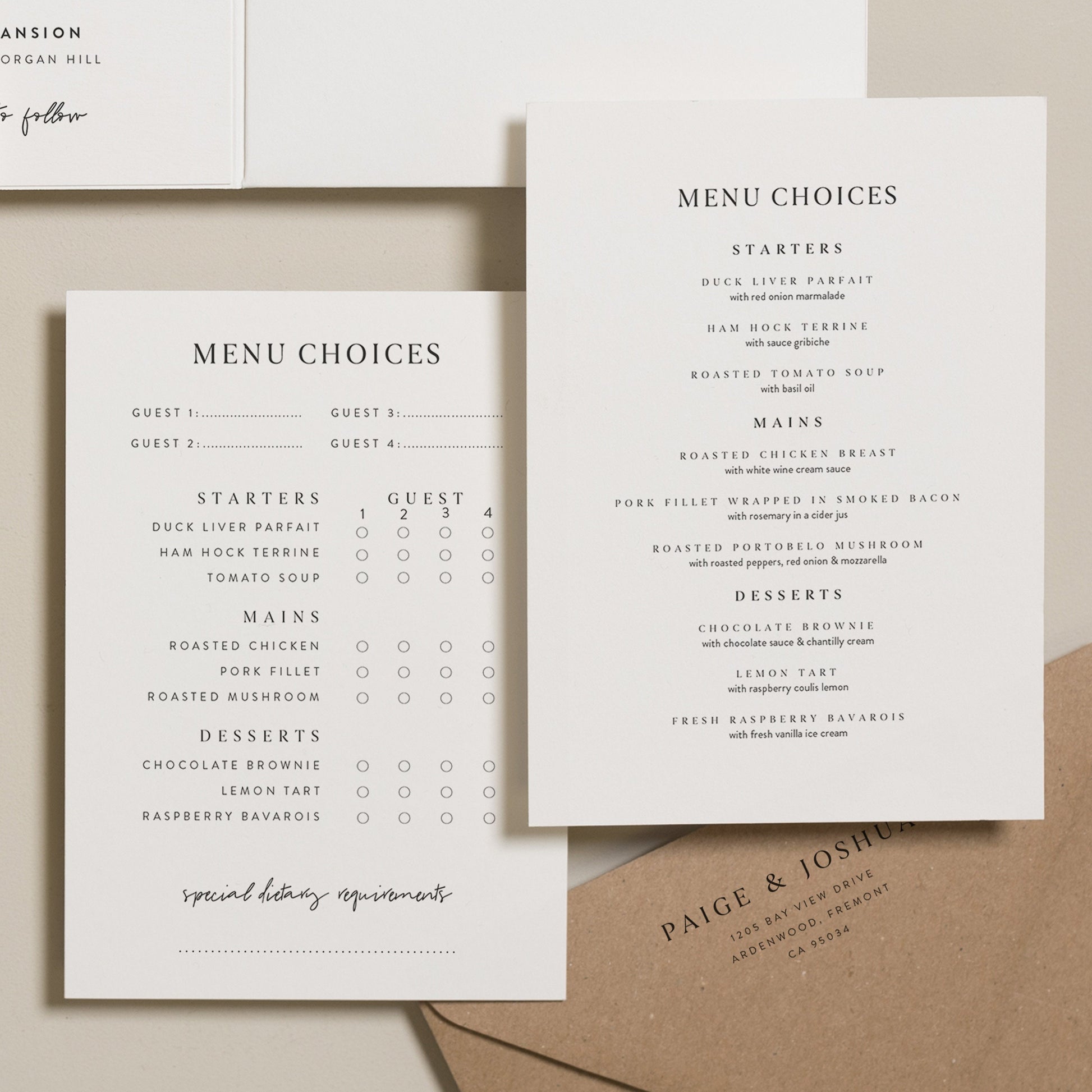 RSVPS: Choose one sided for a simple yes/no response or both sides for menu choices.