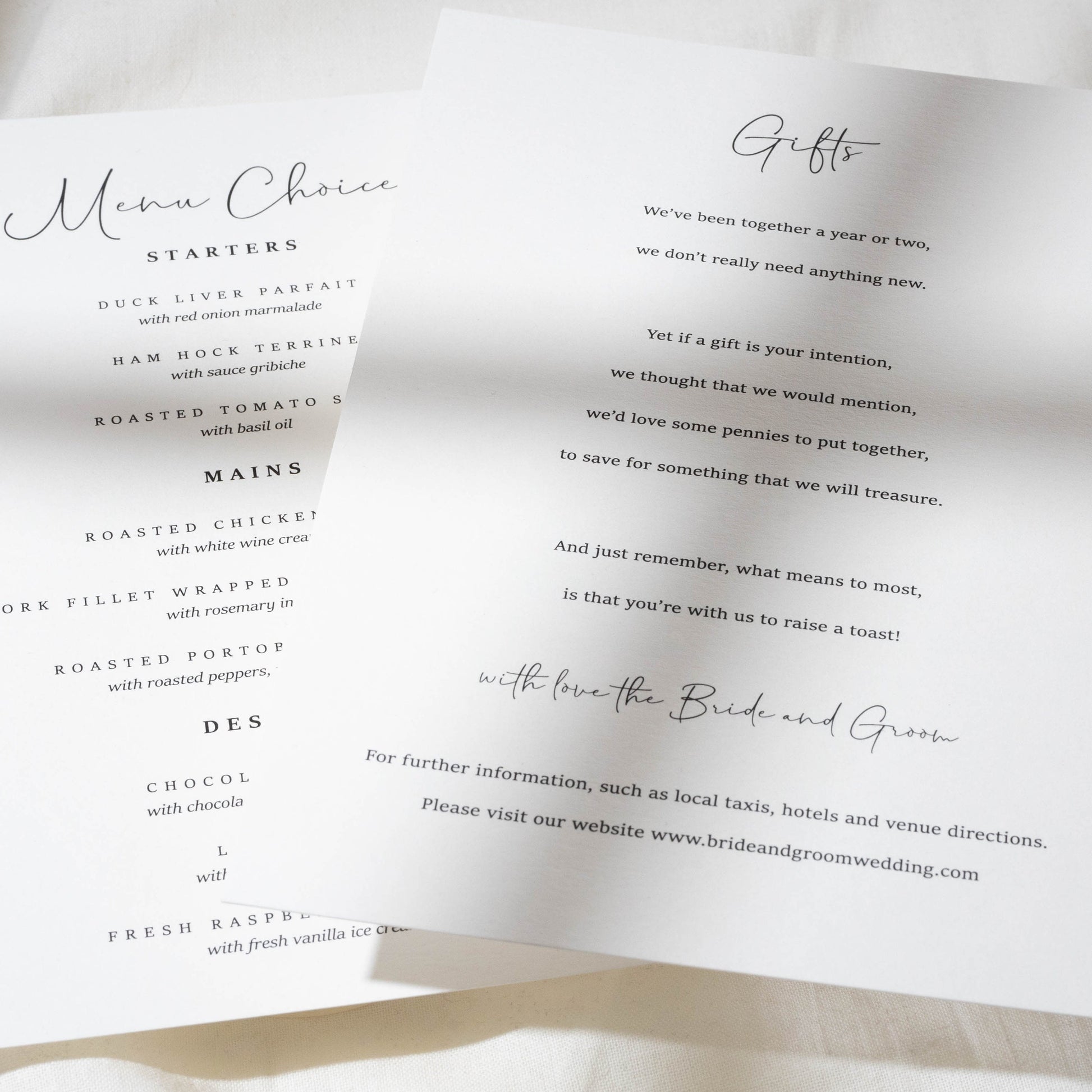 INFO CARDS: Useful for additional info such as taxi numbers, hotels, gift lists, poem's and more.