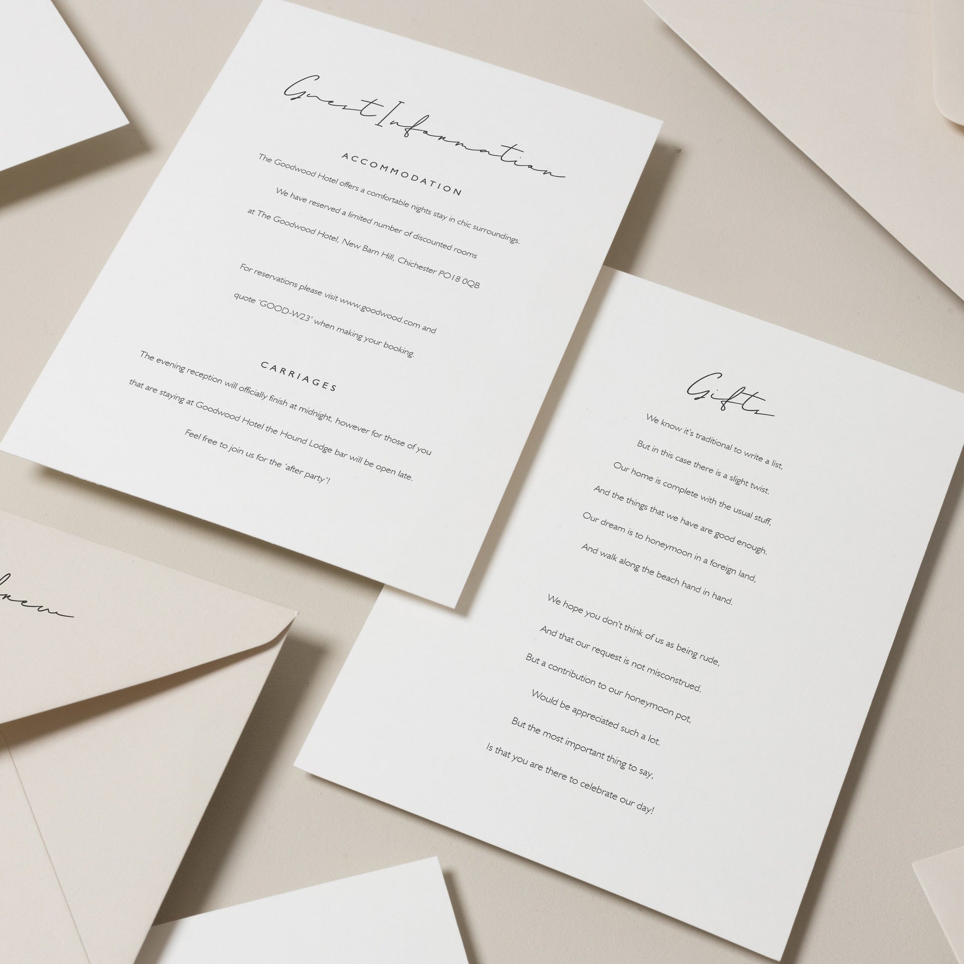INFO CARDS: Useful for additional info such as taxi numbers, hotels, gift lists, poem's and more.