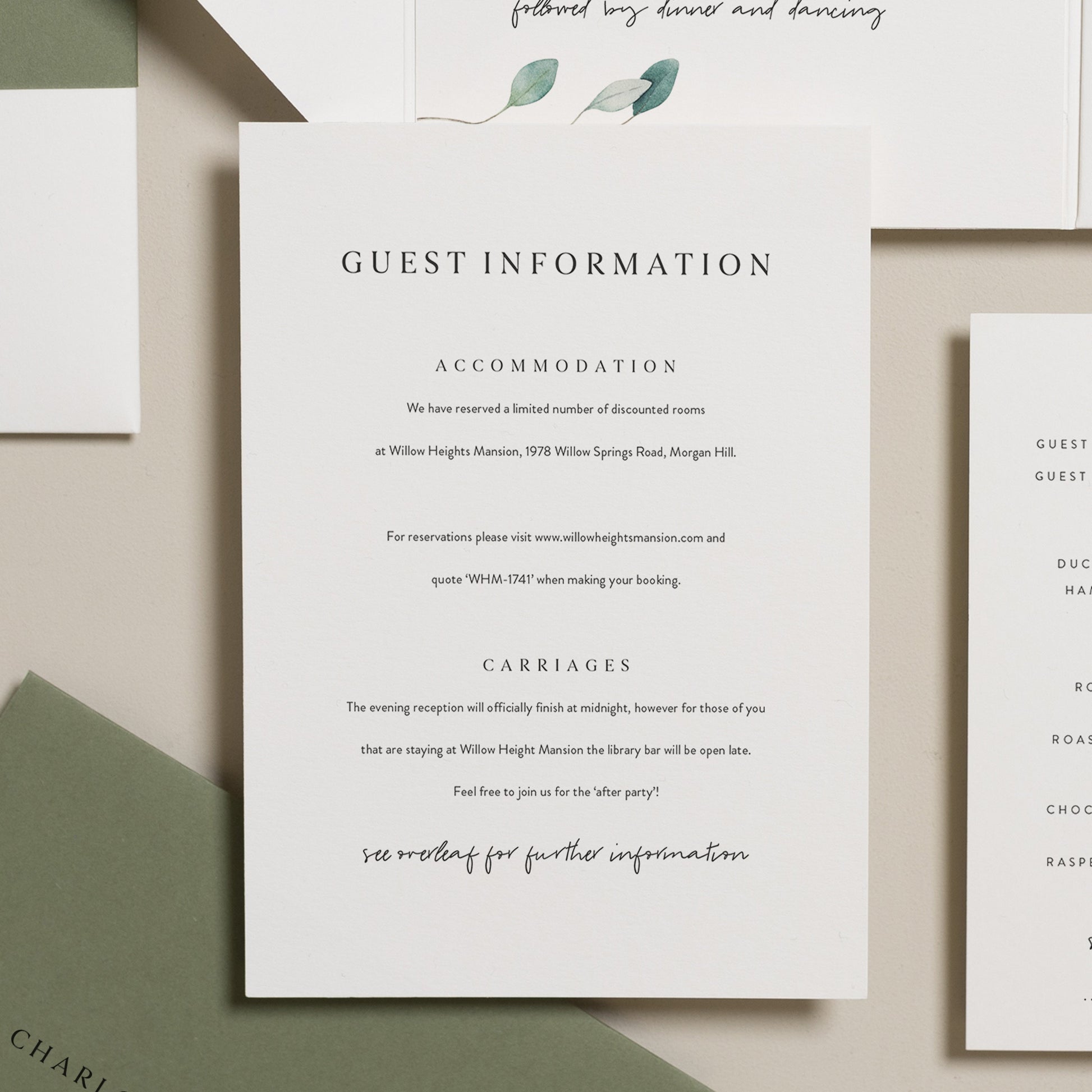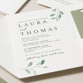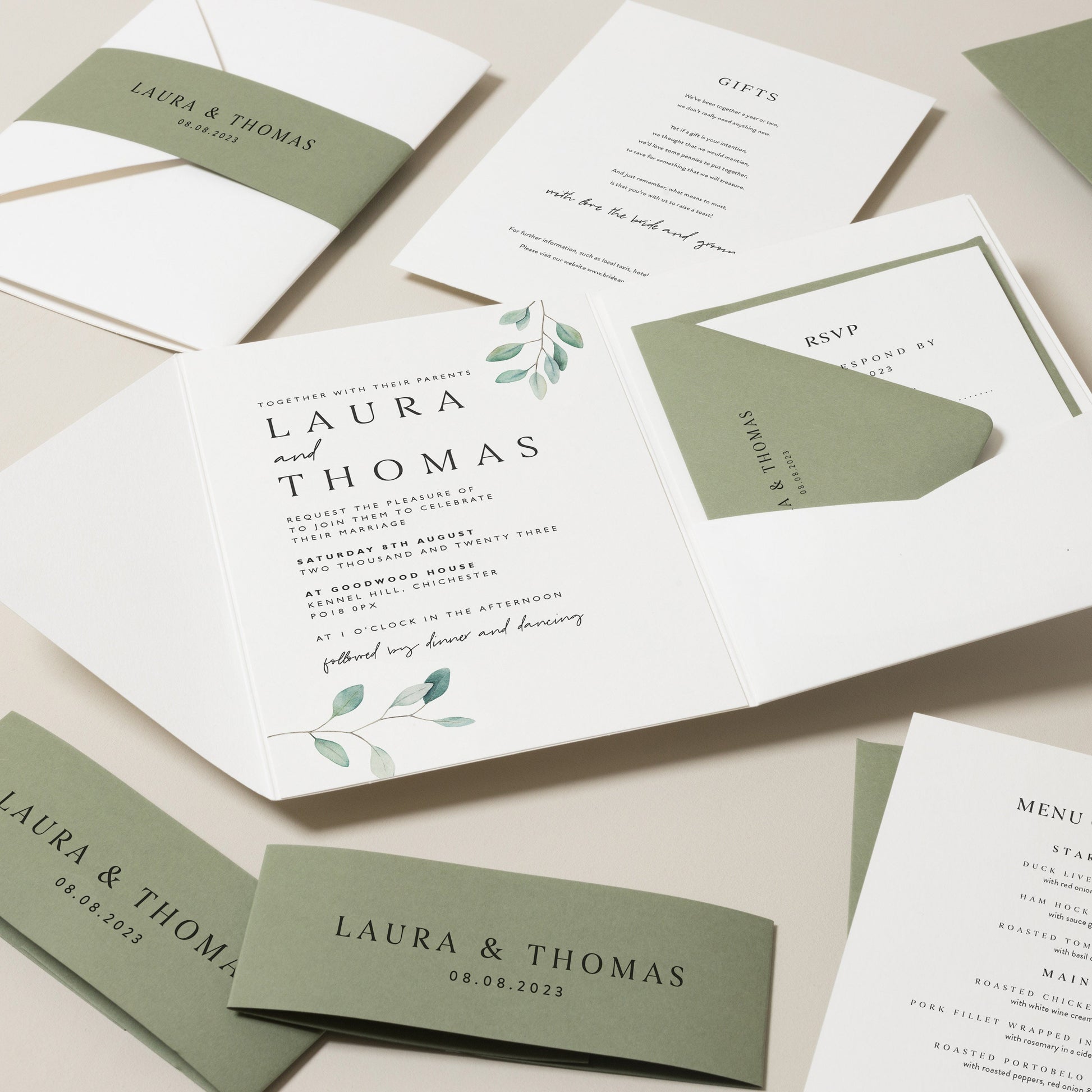 Add a touch of freshness to your wedding invitations with our Laura design, featuring sage greens and olive leaves they're perfect for your big day! Our pocketfold invites allow you to have lots or a little info, all concealed in a neat envelope. A little bundle of excitement!