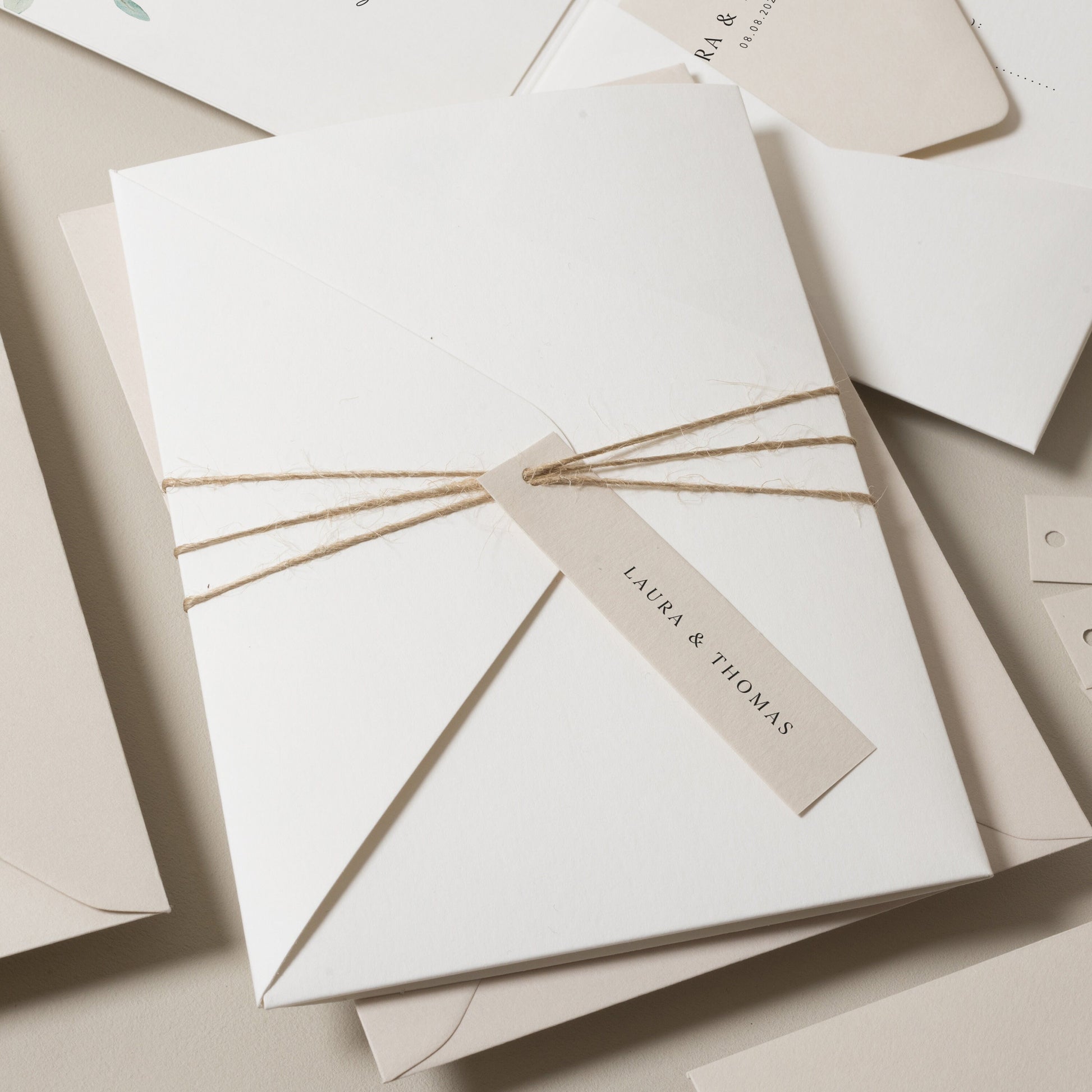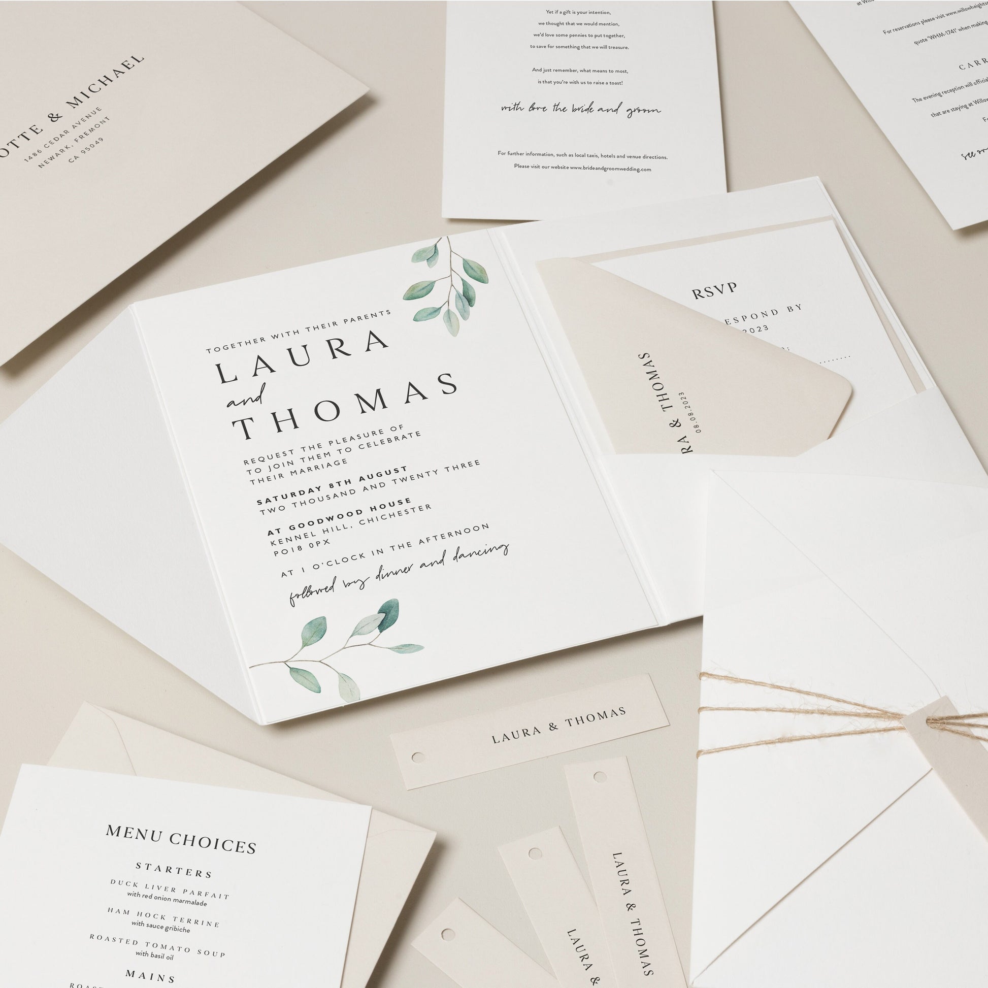 Add a touch of freshness to your wedding invitations with our Laura design, featuring sage greens and olive leaves they're perfect for your big day! Our pocketfold invites allow you to have lots or a little info, all concealed in a neat envelope. A little bundle of excitement!