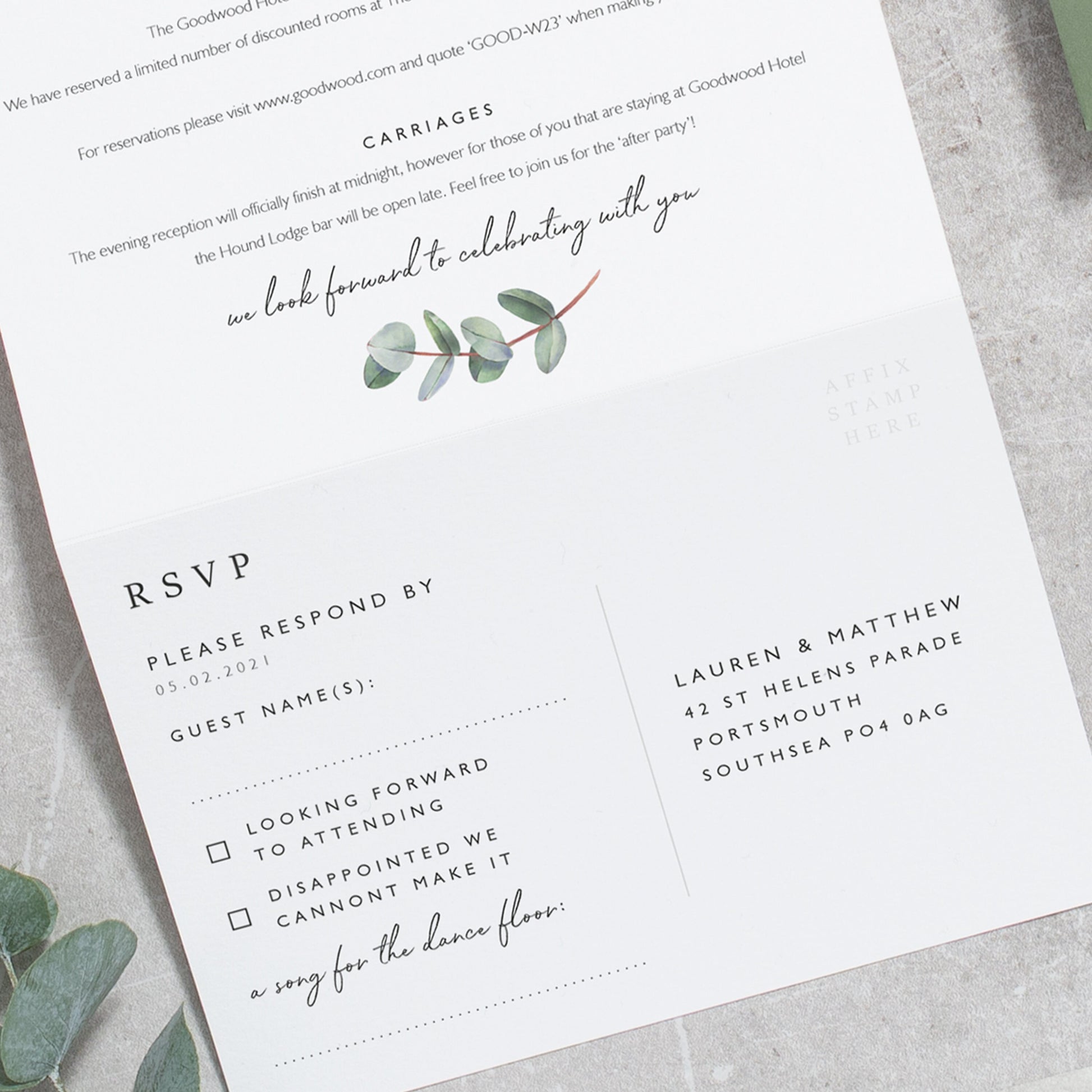 RSVPS: Choose one sided for a simple yes/no response or both sides for menu choices.