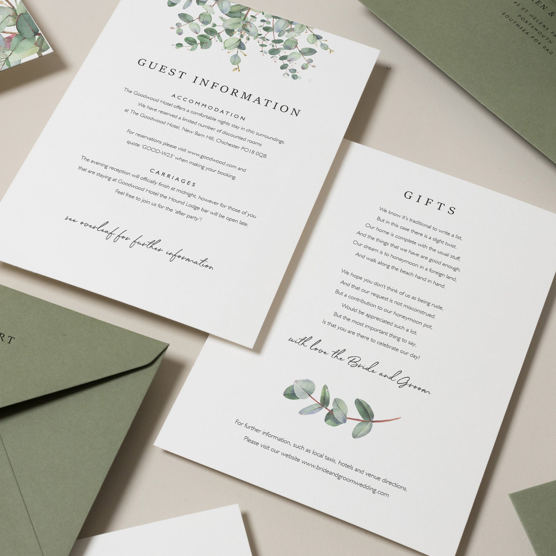 INFO CARDS: Useful for additional info such as taxi numbers, hotels, gift lists, poem's and more.