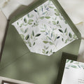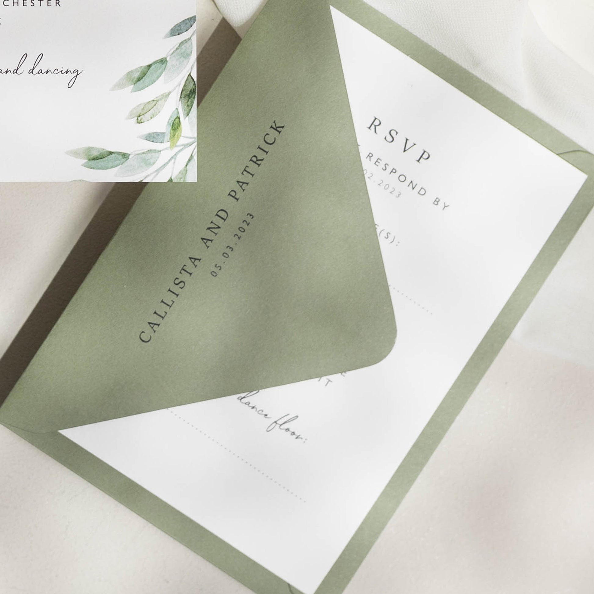 With sage greens and olive leaves, our Callista design is the perfect way to bring some freshness to your wedding invitations! With lots or a little info you can tailor your postcard wedding invites to suit you making them the best thing to come through the letter box!