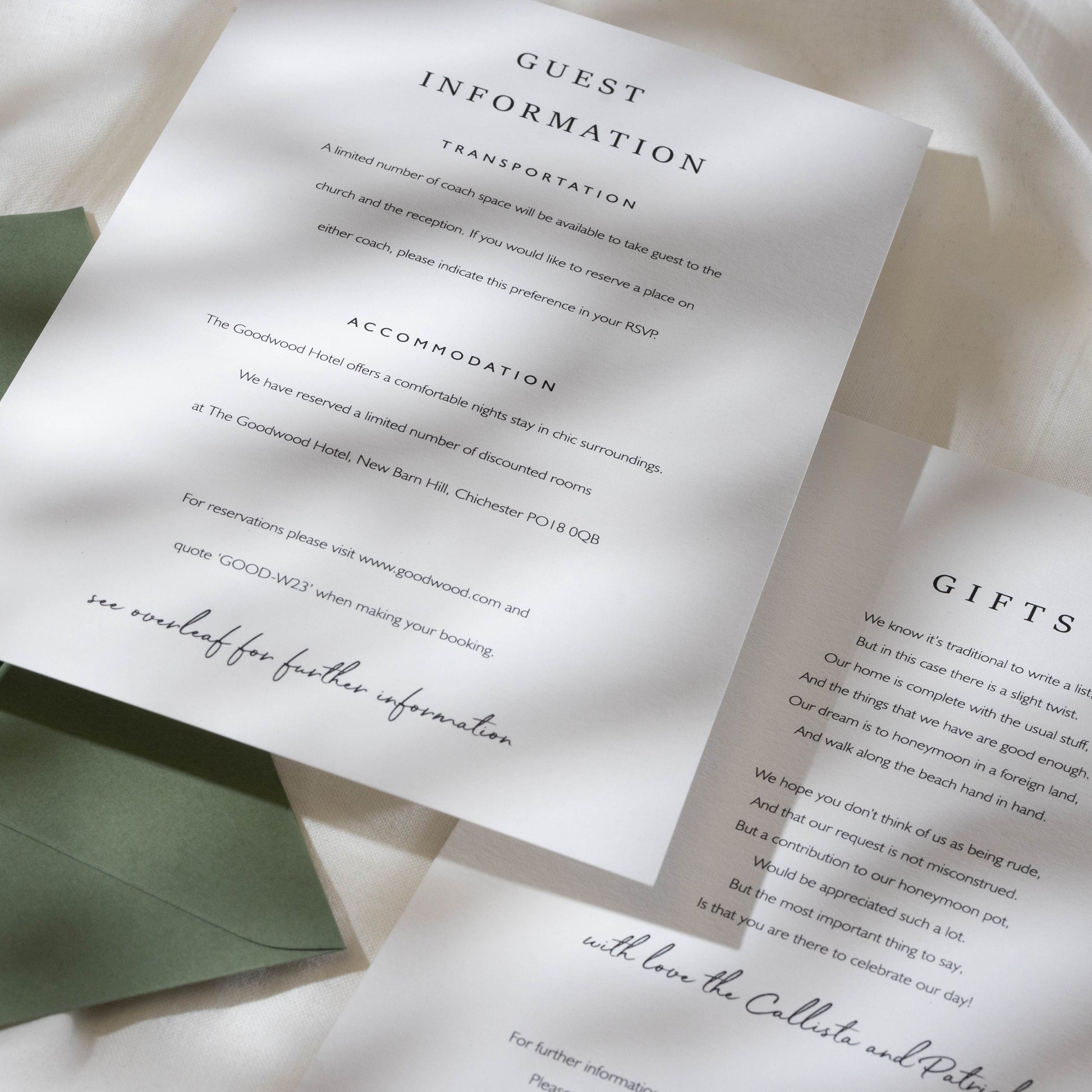 INFO CARDS: Useful for additional info such as taxi numbers, hotels, gift lists, poem's and more.