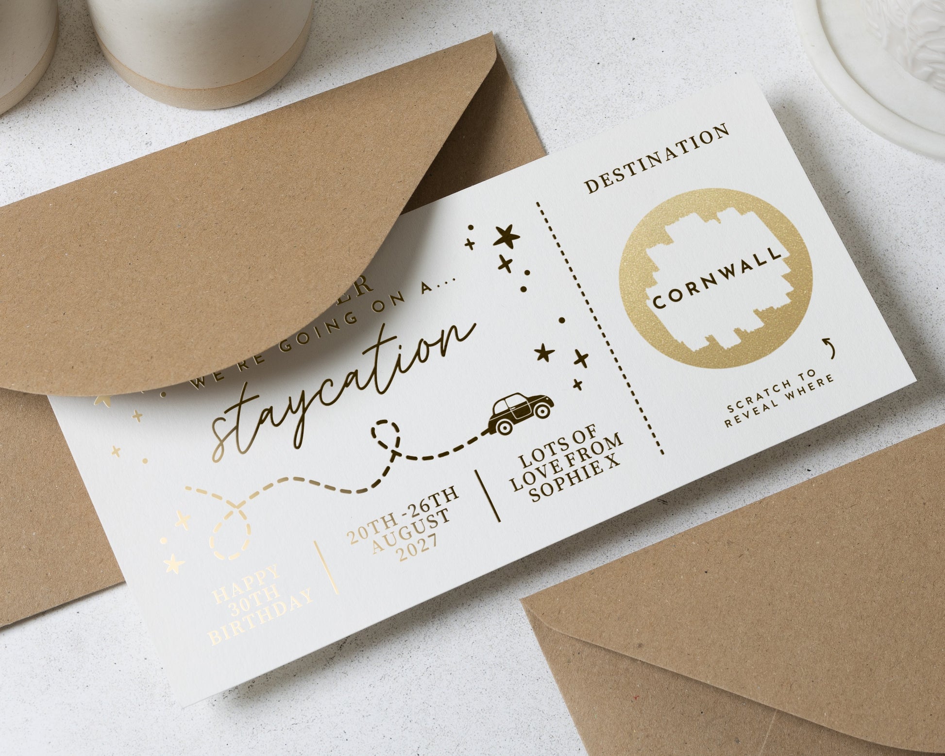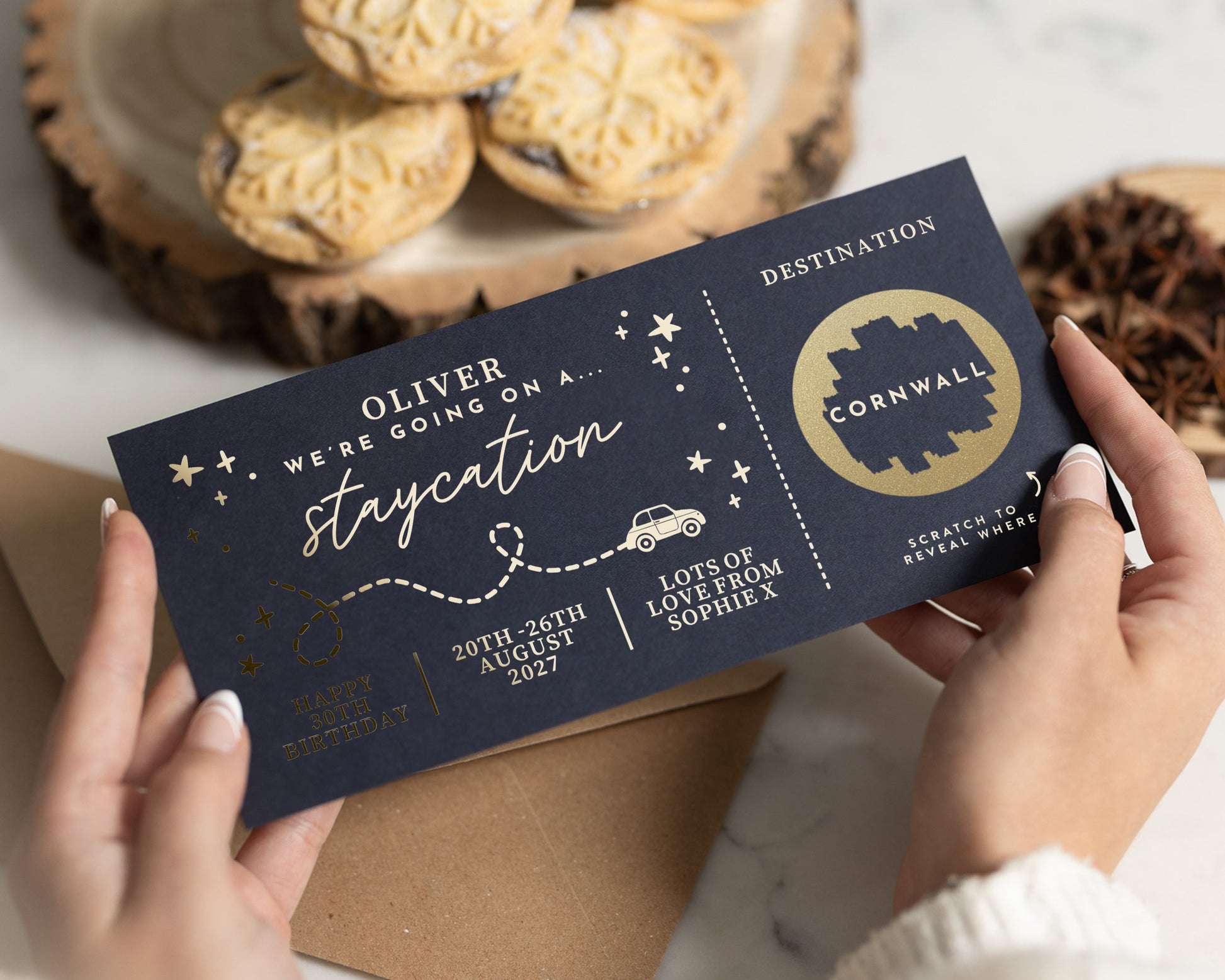 Surprise a loved one with this personalised staycation gift voucher, featuring gold foil details and a scratch to reveal destination panel. Perfect for birthdays, anniversaries, or a special weekend away.