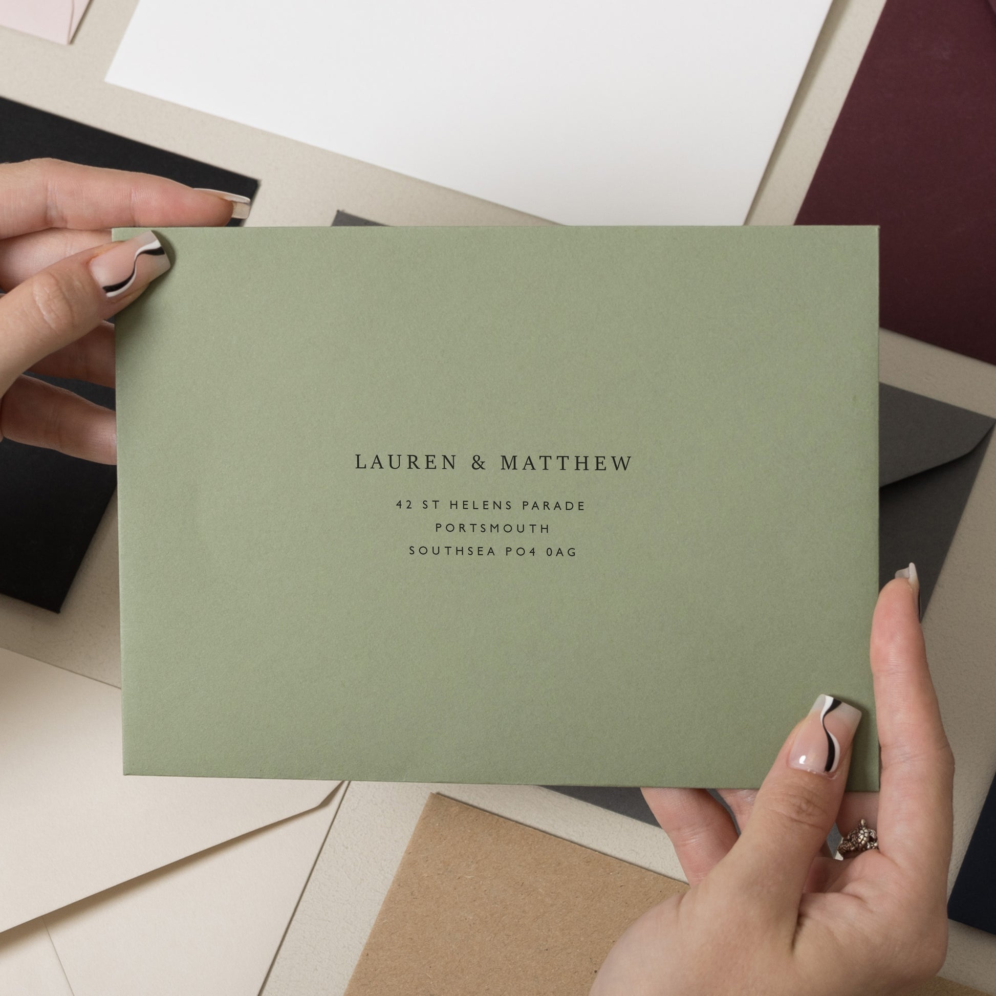 For envelopes that can be printed, for the front of the envelopes, we offer the convenience of variable printing. Simply provide us with an Excel file containing the names and addresses of your guests, and we will print them for you, saving you the trouble of hand writing each one. On the back of the envelope, you can choose to print your return address, adding a professional touch to your correspondence. All printing is done in elegant black ink, ensuring a classic and timeless look.