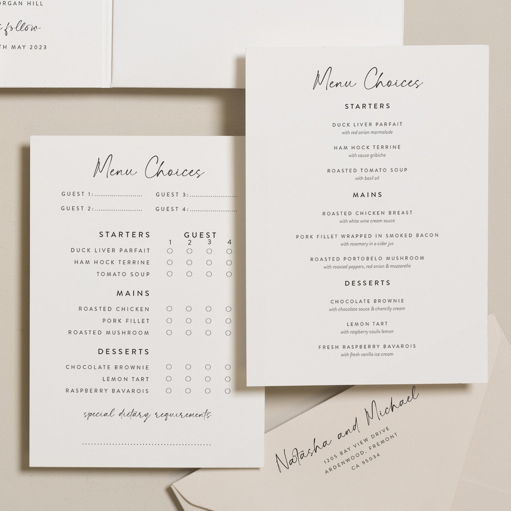 RSVPS: Choose one sided for a simple yes/no response or both sides for menu choices.