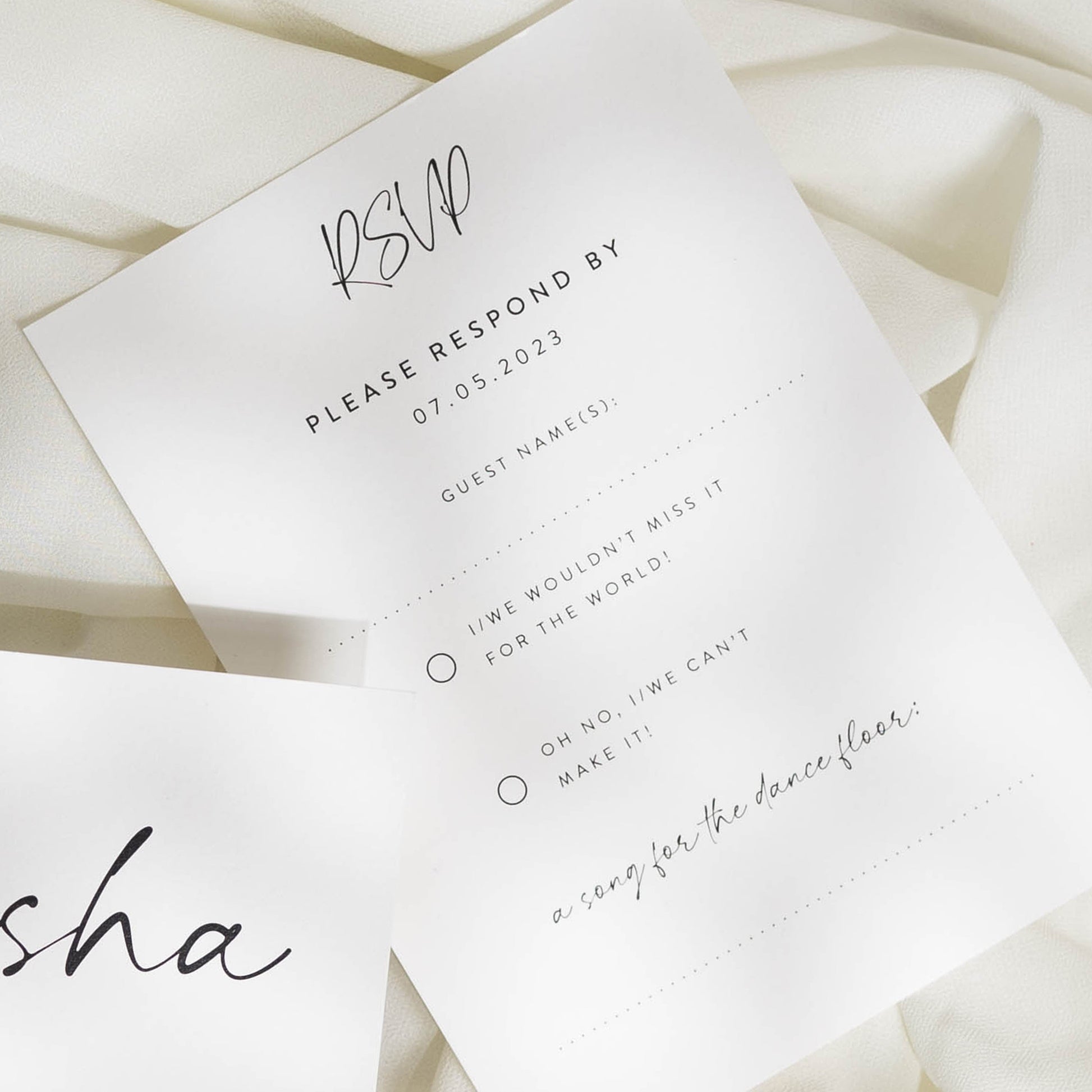 RSVPS: Choose one sided for a simple yes/no response or both sides for menu choices.