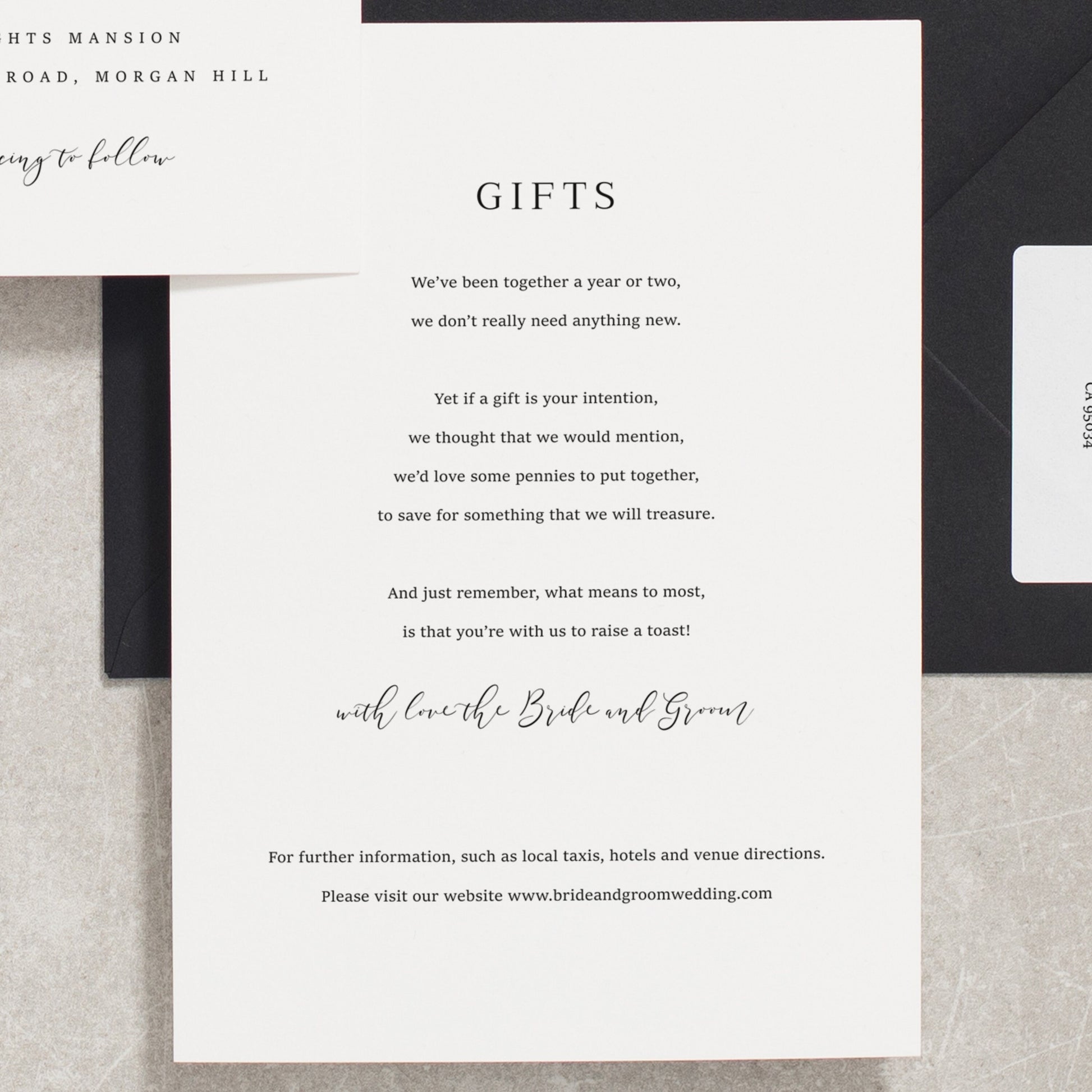 INFO CARDS: Useful for additional info such as taxi numbers, hotels, gift lists, poem's and more.