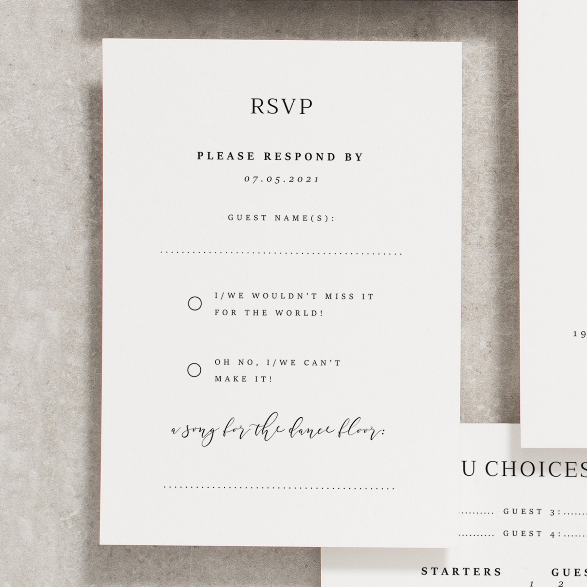RSVPS: Choose one sided for a simple yes/no response or both sides for menu choices.