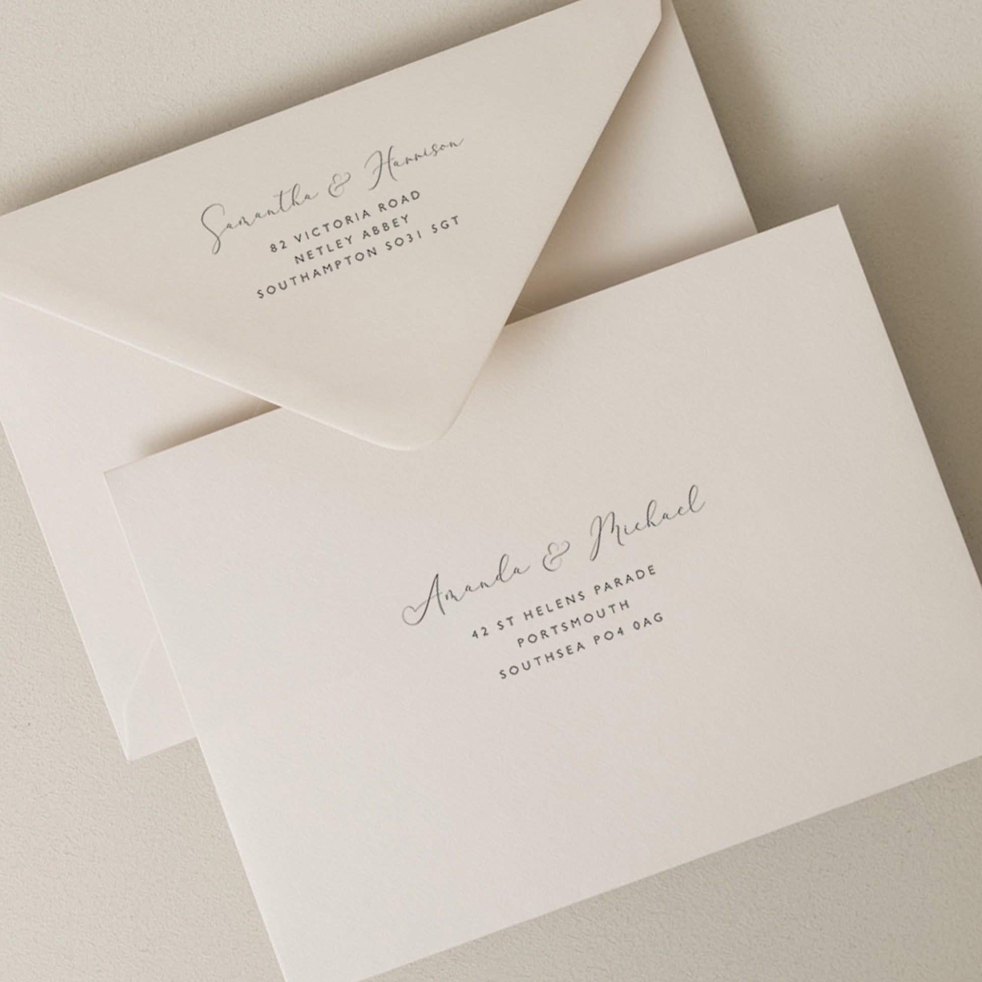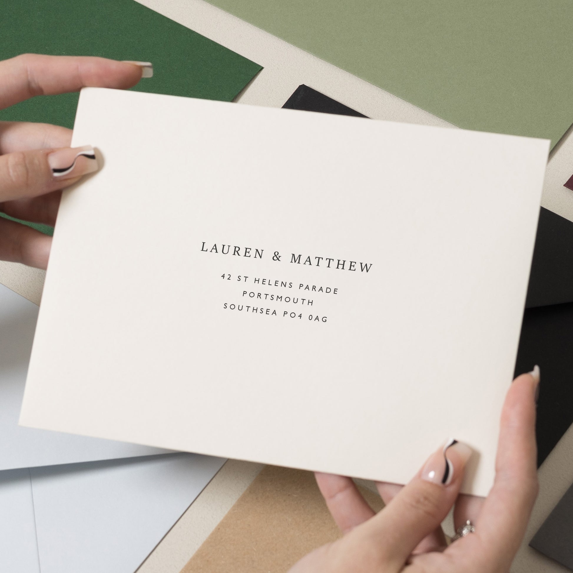 For envelopes that can be printed, for the front of the envelopes, we offer the convenience of variable printing. Simply provide us with an Excel file containing the names and addresses of your guests, and we will print them for you, saving you the trouble of hand writing each one. On the back of the envelope, you can choose to print your return address, adding a professional touch to your correspondence. All printing is done in elegant black ink, ensuring a classic and timeless look.