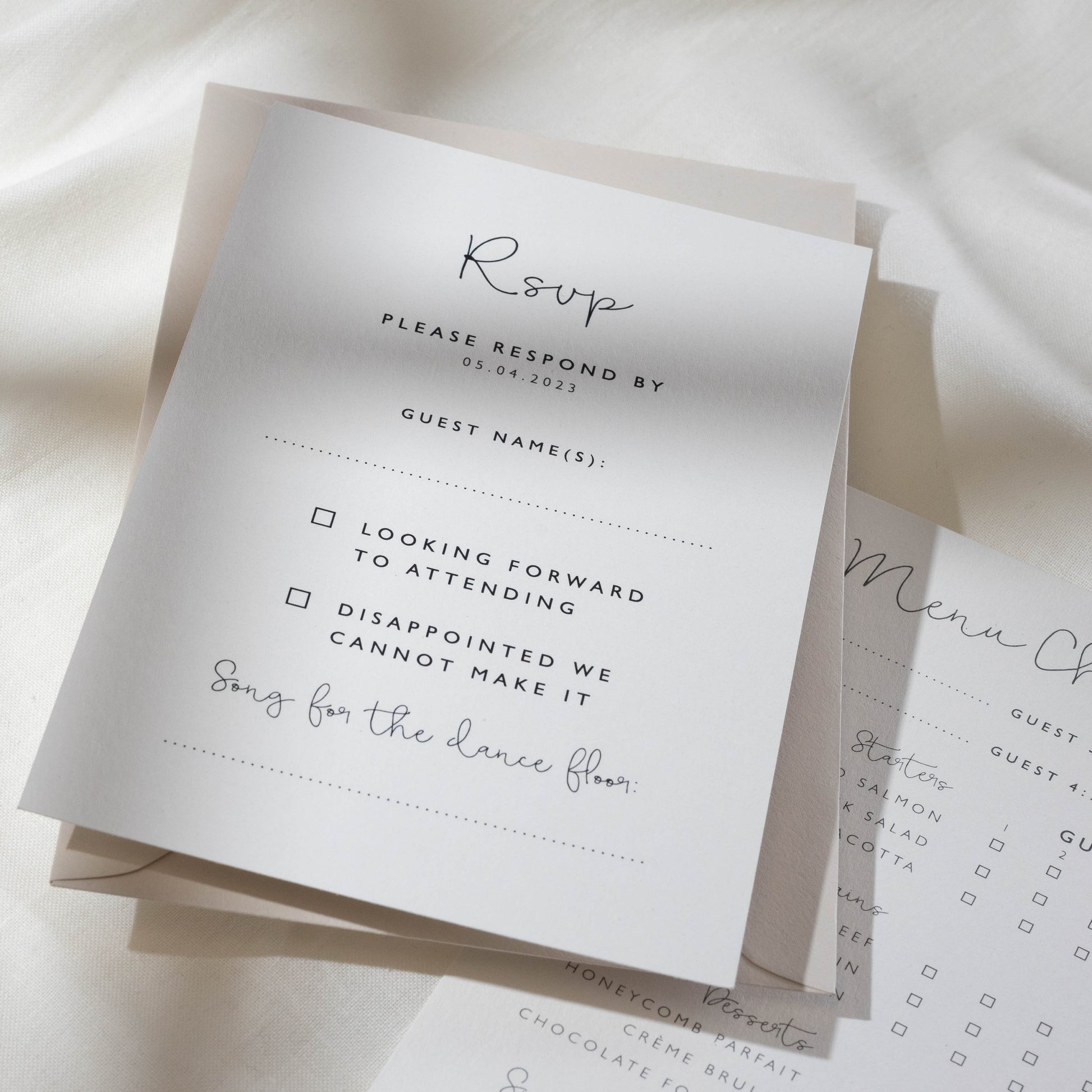 RSVPS: Choose one sided for a simple yes/no response or both sides for menu choices.