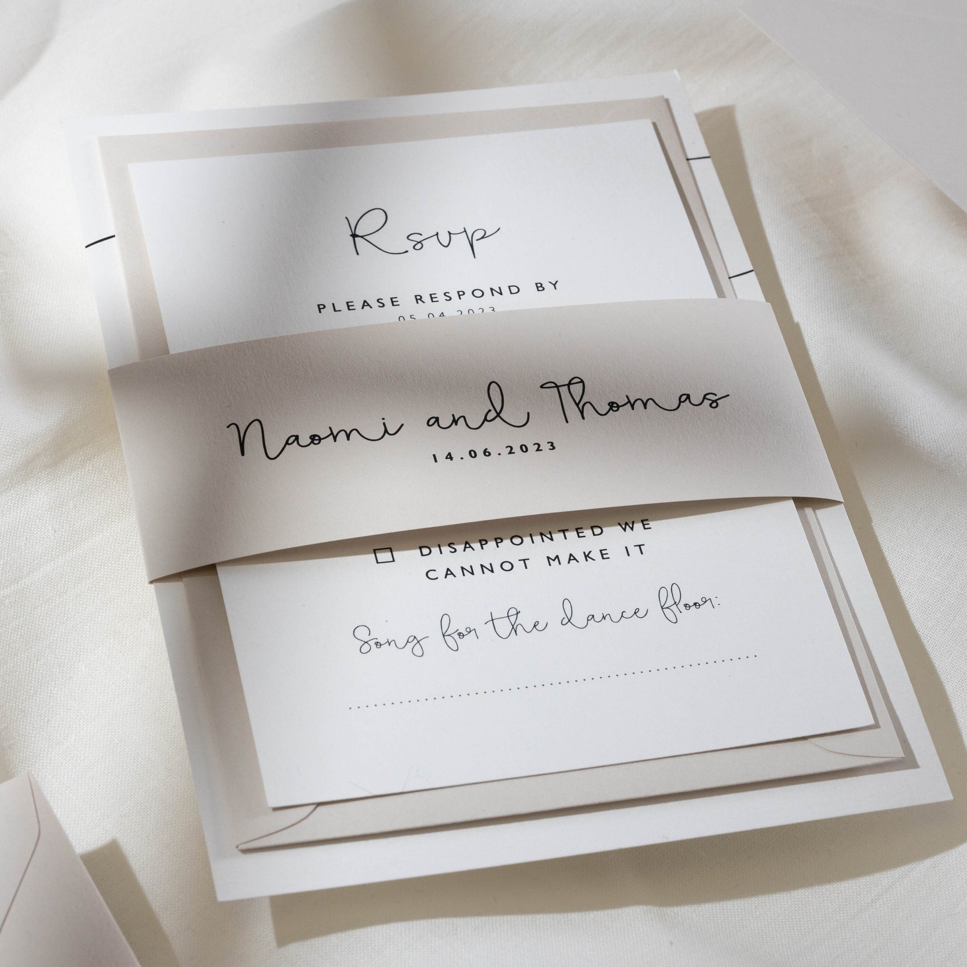 VELLUM JACKETS: Our translucent vellum jackets wrap around your invitations to add interest, texture and intrigue.