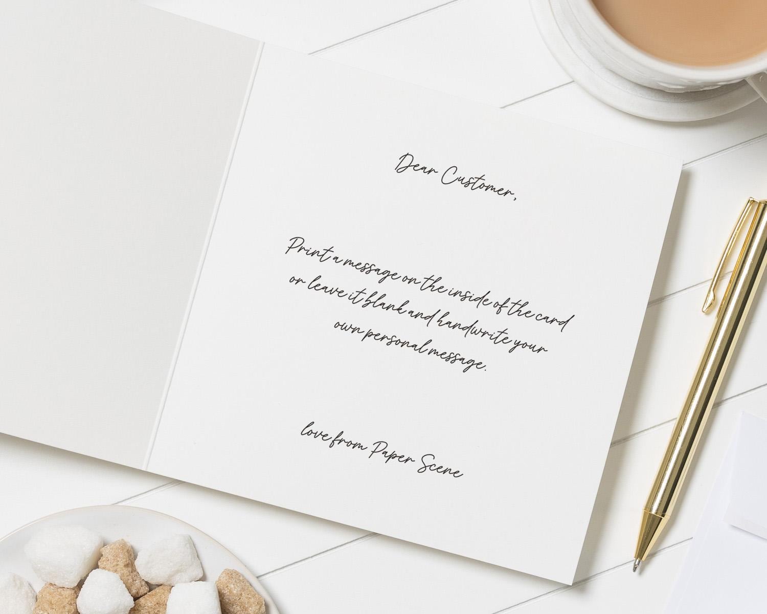 We can also print a message inside your card, or leave it blank for you to handwrite. Just include your exact message in the personalisation box.