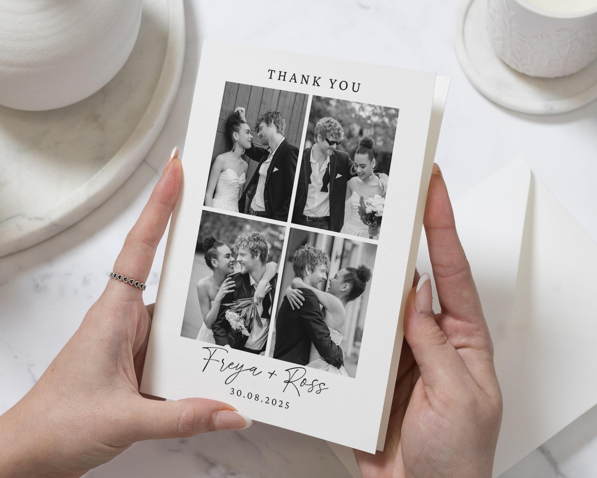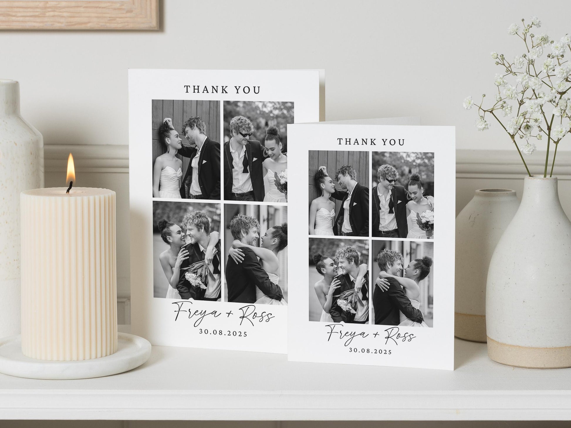 Our wedding thank you cards are fully personalised – featuring your chosen photo (or photos!) and wording to match your style. Whether you prefer something modern and minimal or a design with a touch of elegance, we’ll help you create a card that feels uniquely you.