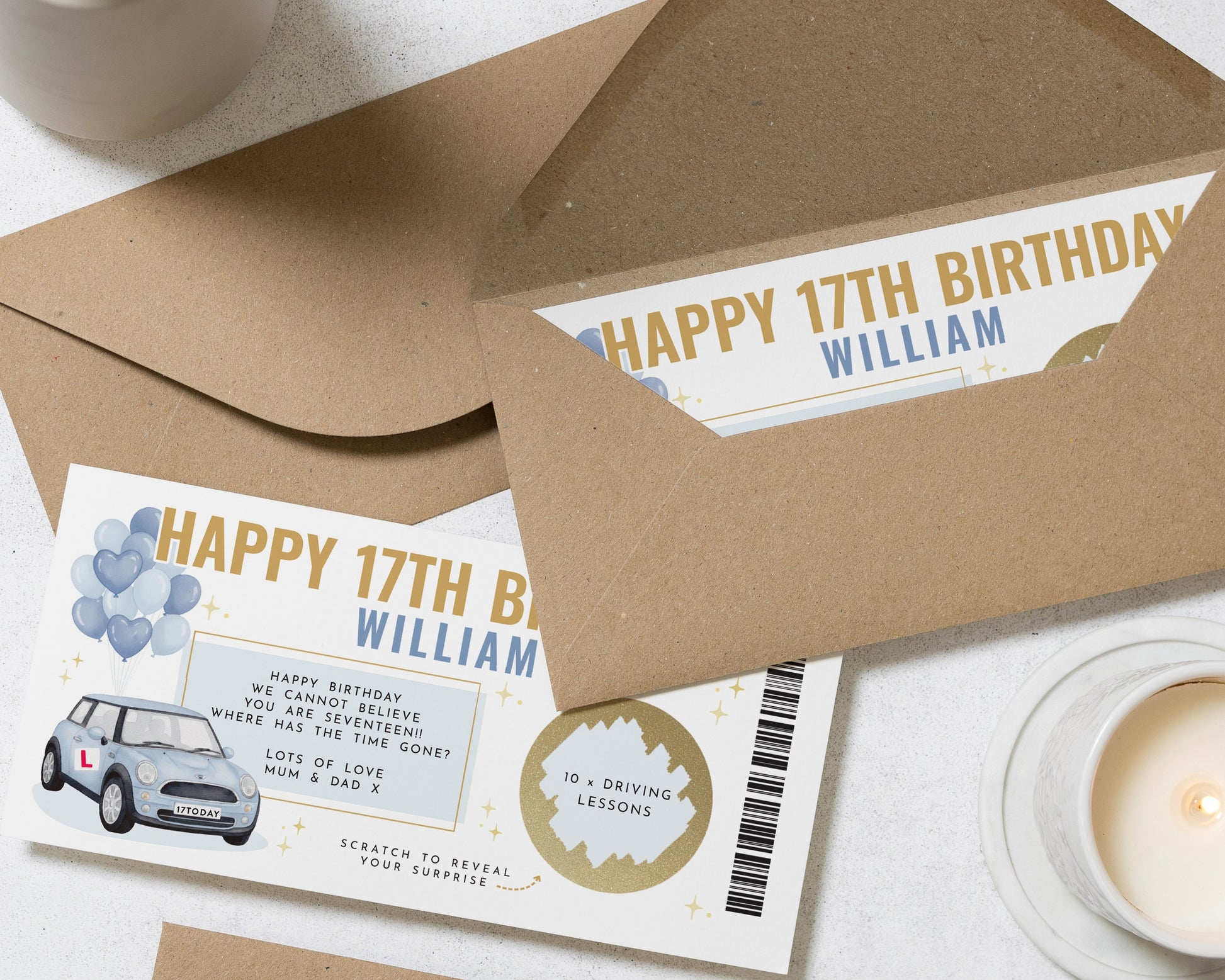 Celebrate a milestone with this personalised 17th birthday gift voucher featuring a scratch to reveal panel for driving lessons. A fun and memorable way to surprise a new driver on their special day.