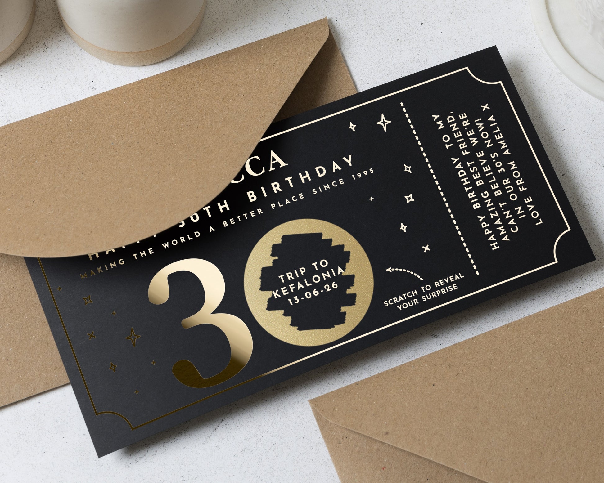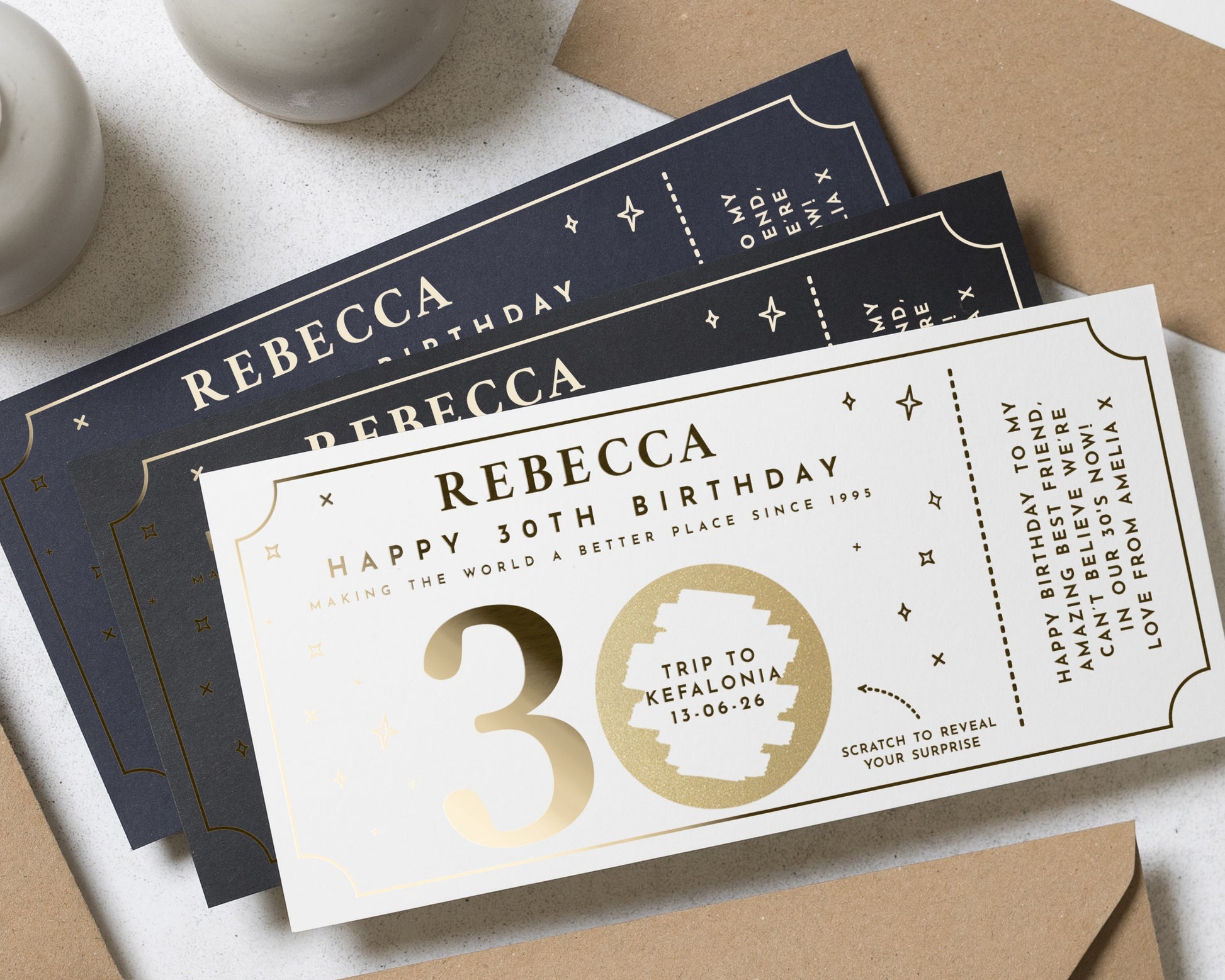 Personalised 30th Birthday Gift Voucher, Scratch To Reveal Holiday, Custom Trip Ticket, Gold Foil Gift For Her