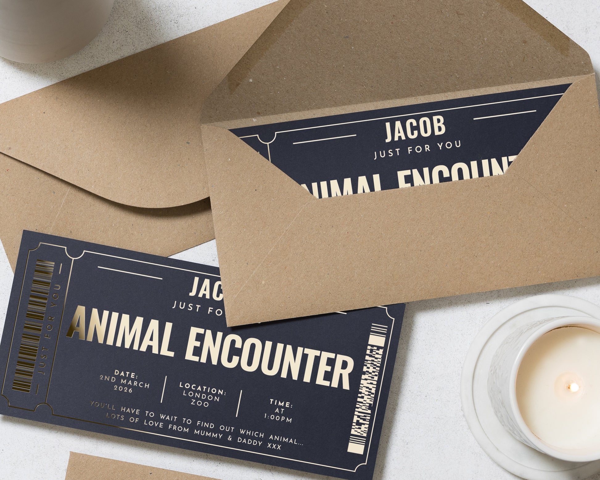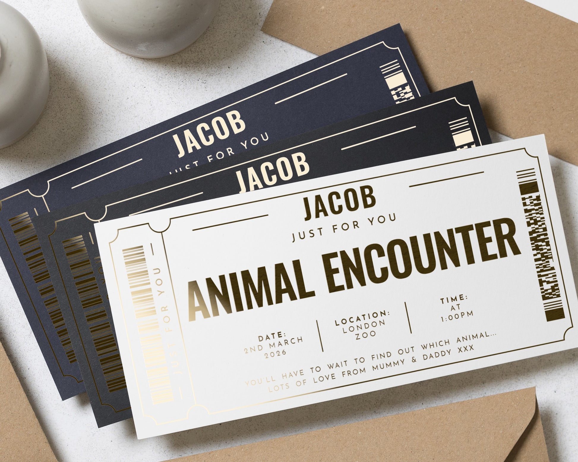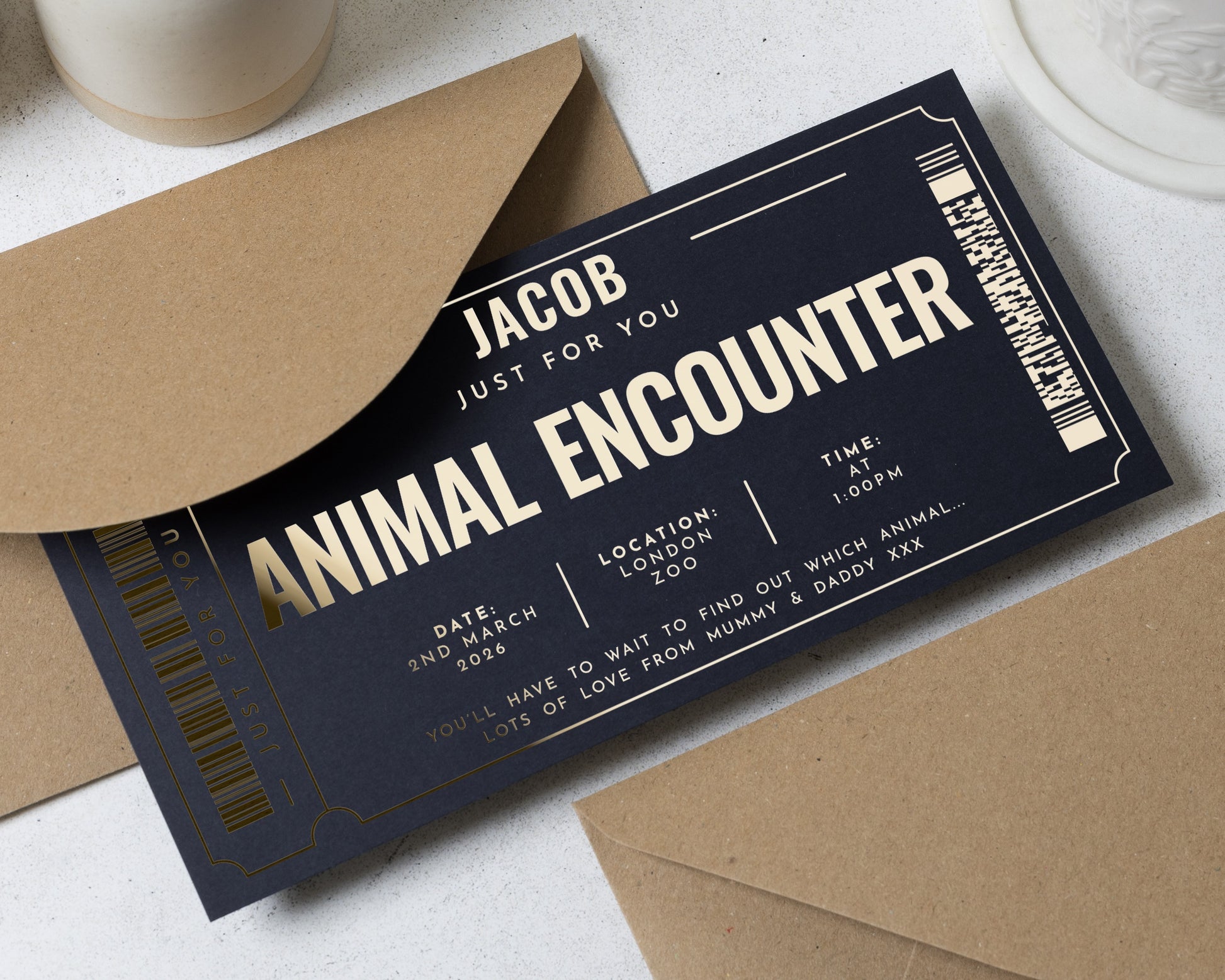 Surprise someone special with a personalised Animal Encounter gift voucher, featuring luxurious gold foil on a stylish navy background. Perfect for birthdays, special occasions, or as a unique experience gift. Customise with your own details.