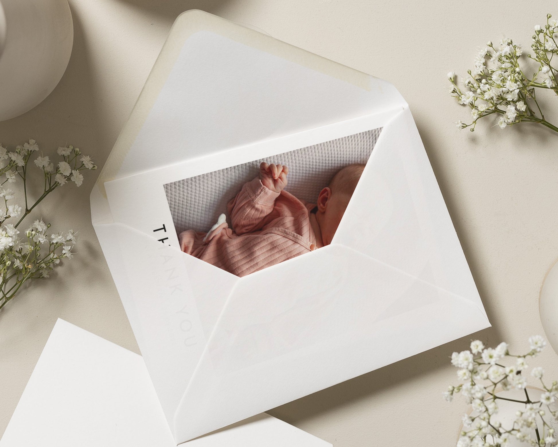 Our baby thank you cards are fully personalised – featuring your favourite photo (or photos!) of your little one and wording of your choice. Whether you’d like something sweet and simple or a design with a touch of charm, we’ll help you create a card that’s as special and unique as your baby.