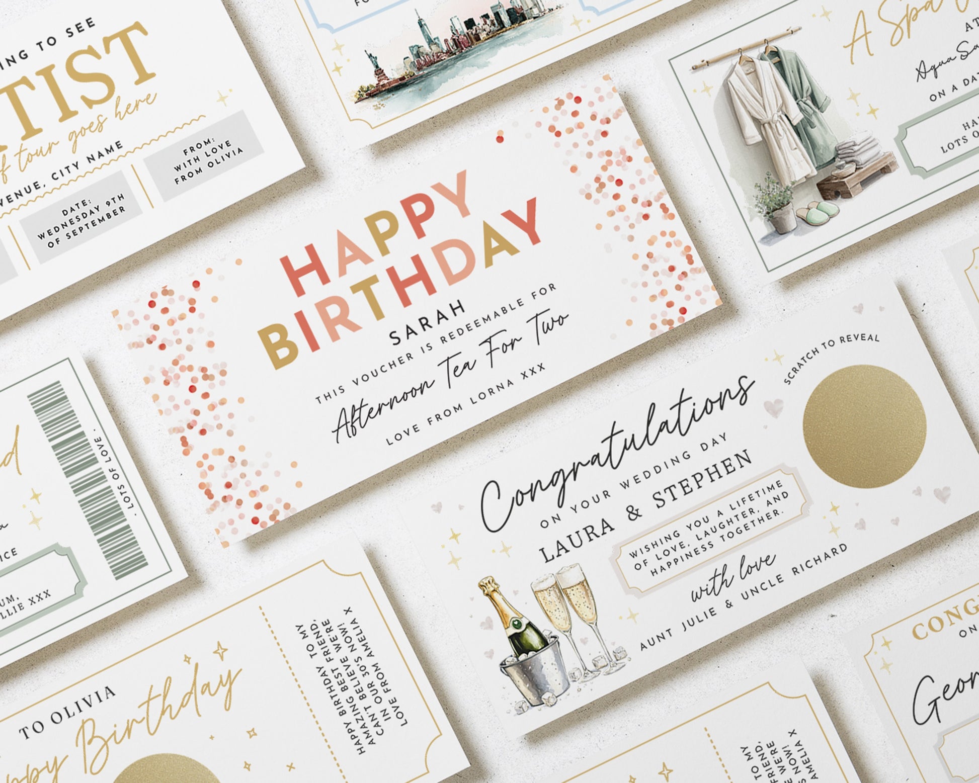 • Each voucher card measures 210x99mm, and is printed on heavyweight premium cardstock.
