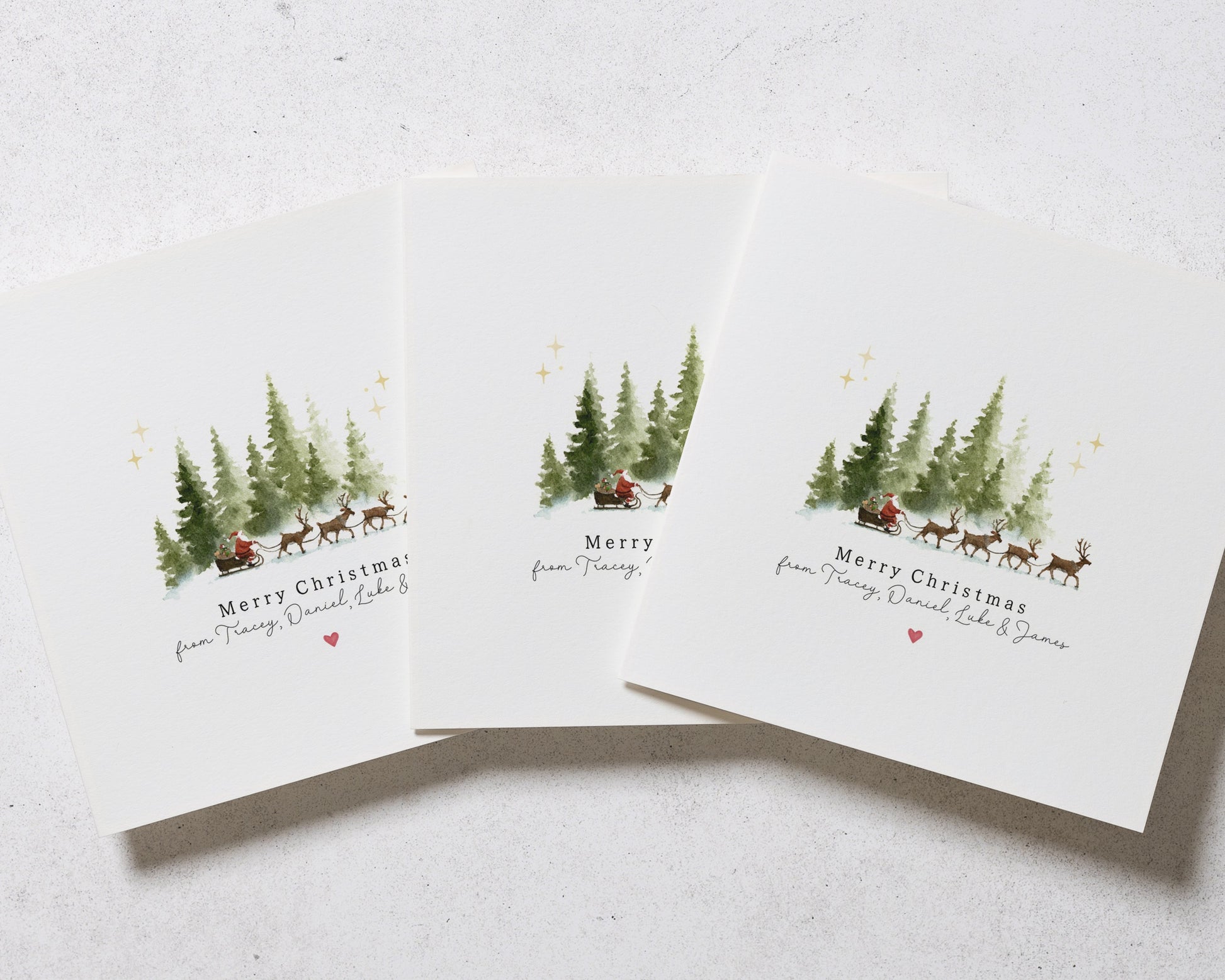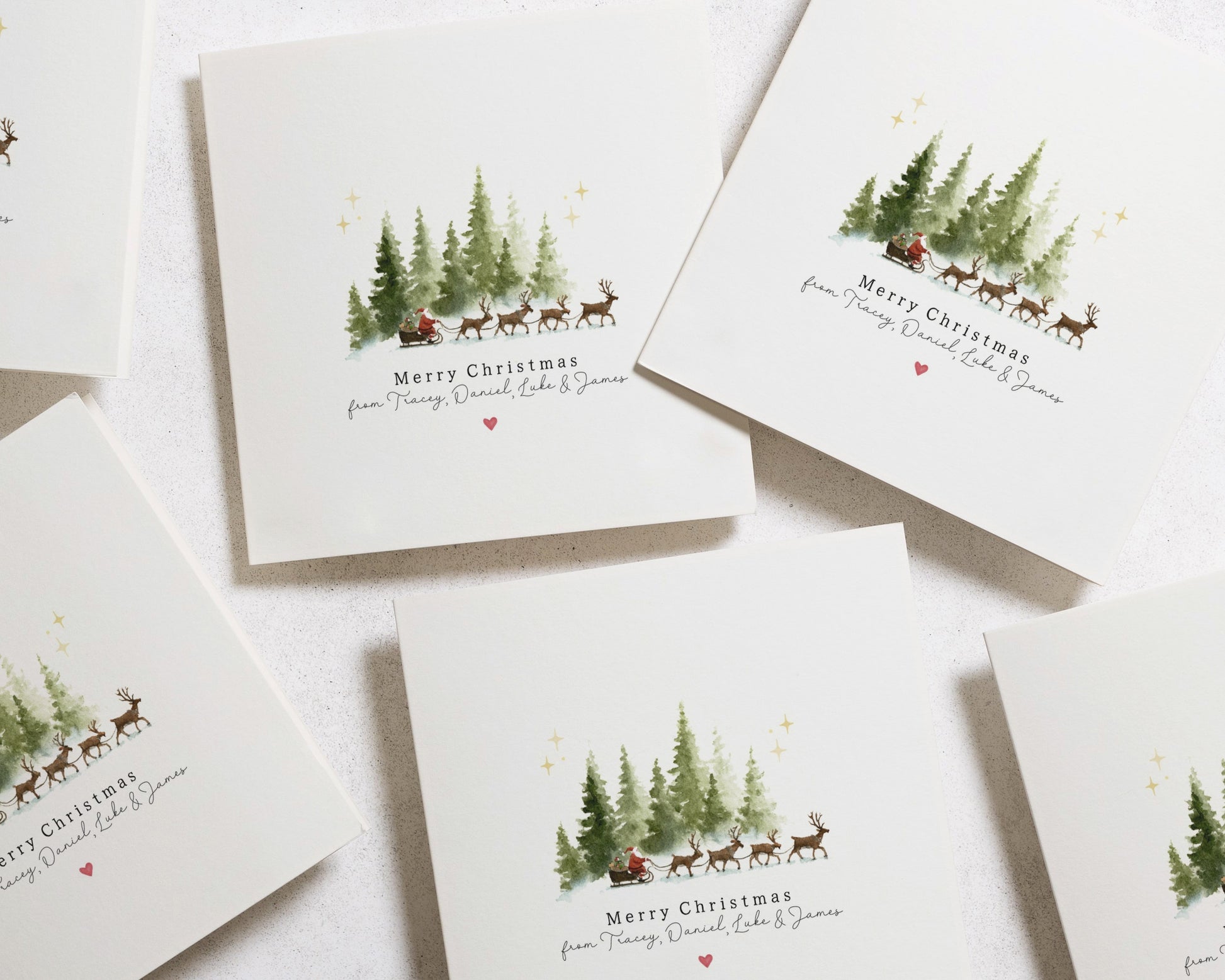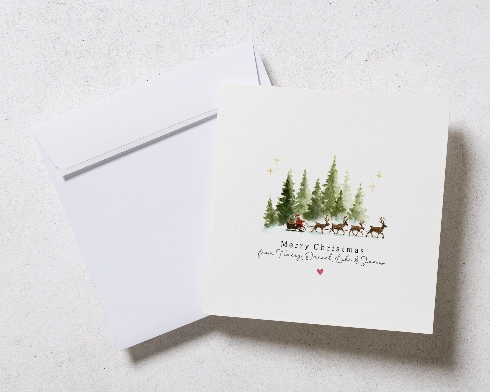 This charming personalised square Christmas card features a watercolour Santa sleigh and reindeer scene with your family names beneath. A festive and unique way to send your holiday wishes.