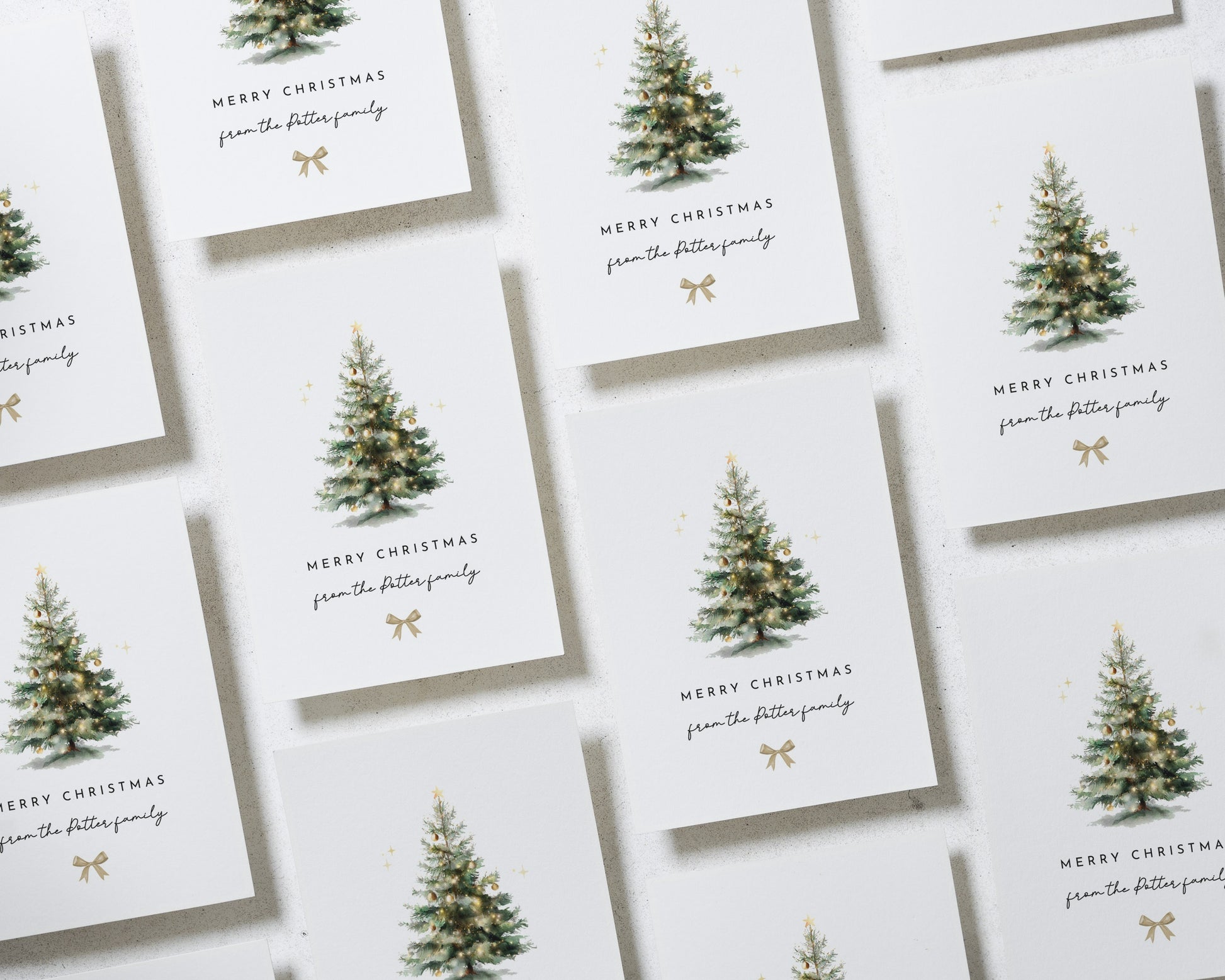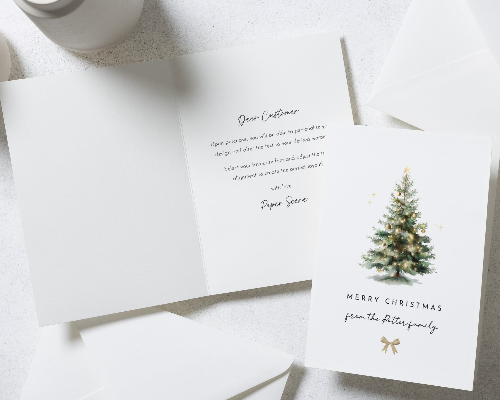 This elegant personalised Christmas card features a beautifully illustrated Christmas tree and custom family name. Perfect for sending festive wishes to loved ones.
