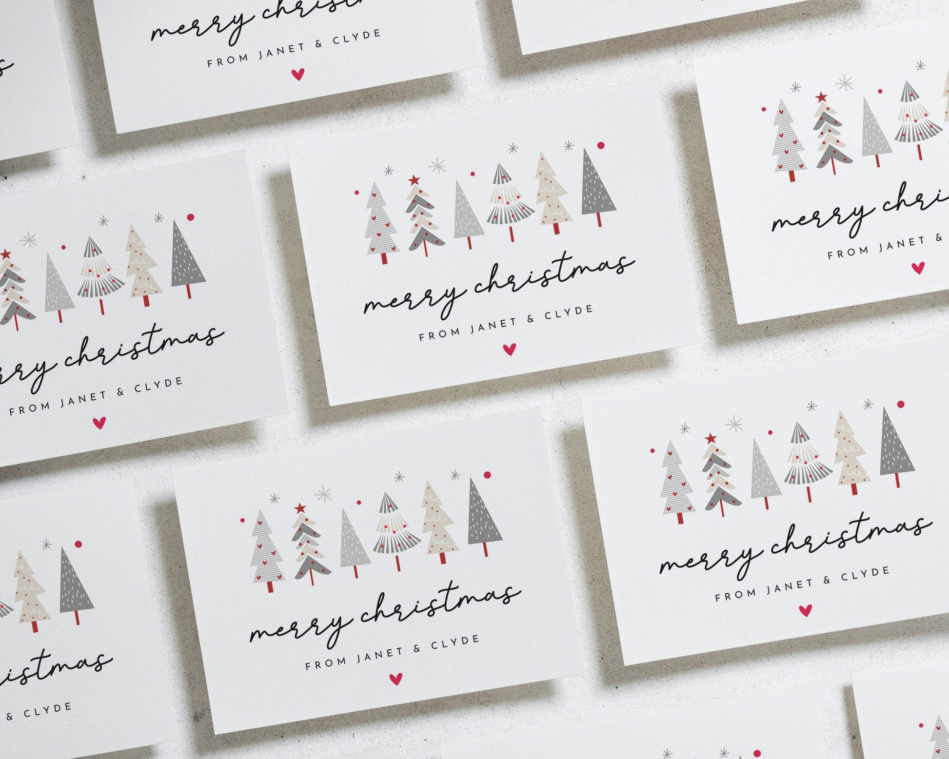 This modern personalised Christmas card features a charming row of festive trees and your custom names beneath a Merry Christmas greeting. Perfect for sending warm wishes to friends and family.