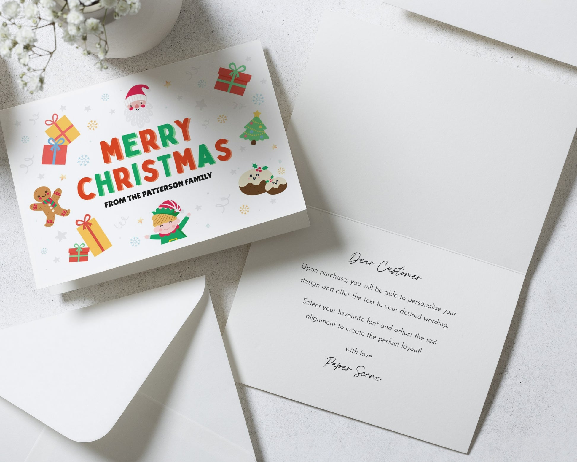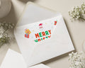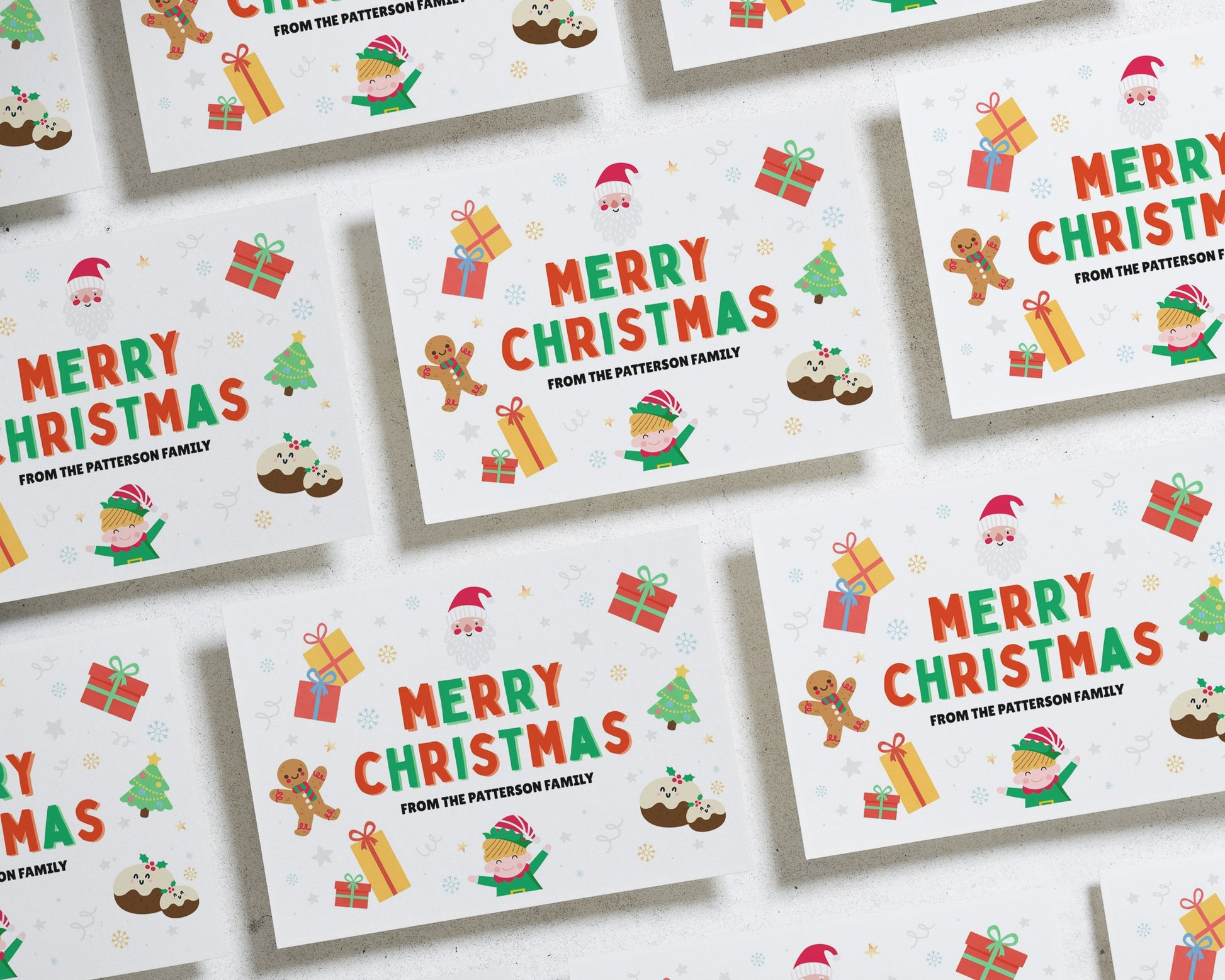 Send festive cheer with this personalised Merry Christmas card featuring playful holiday icons and your family name. Perfect for families and bulk sending.