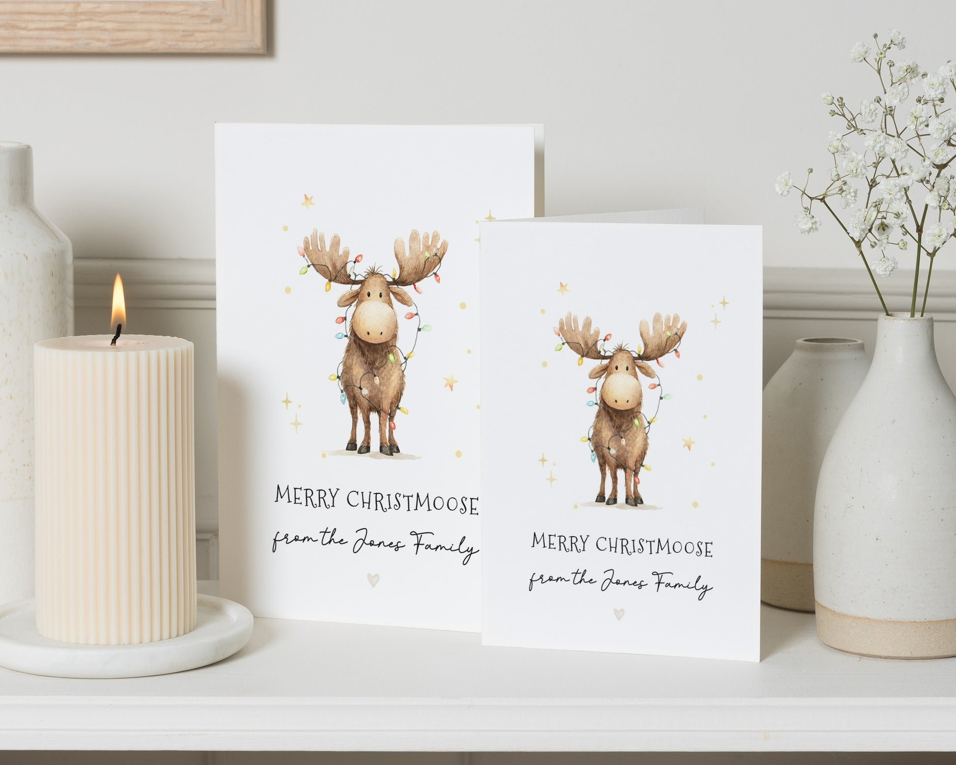 Send festive cheer with this adorable personalised 'Merry Christmoose' Christmas card, featuring a cute illustrated moose and your family name.