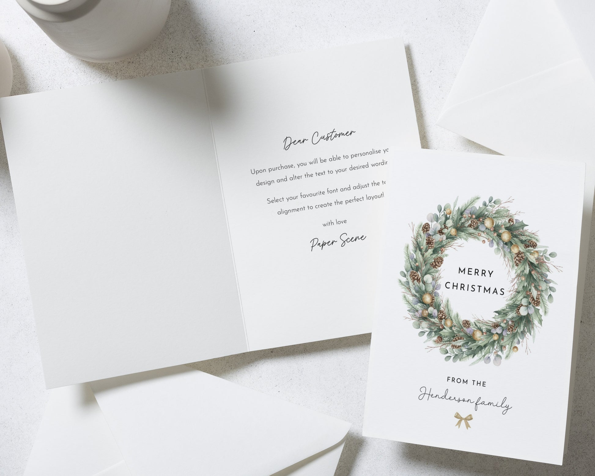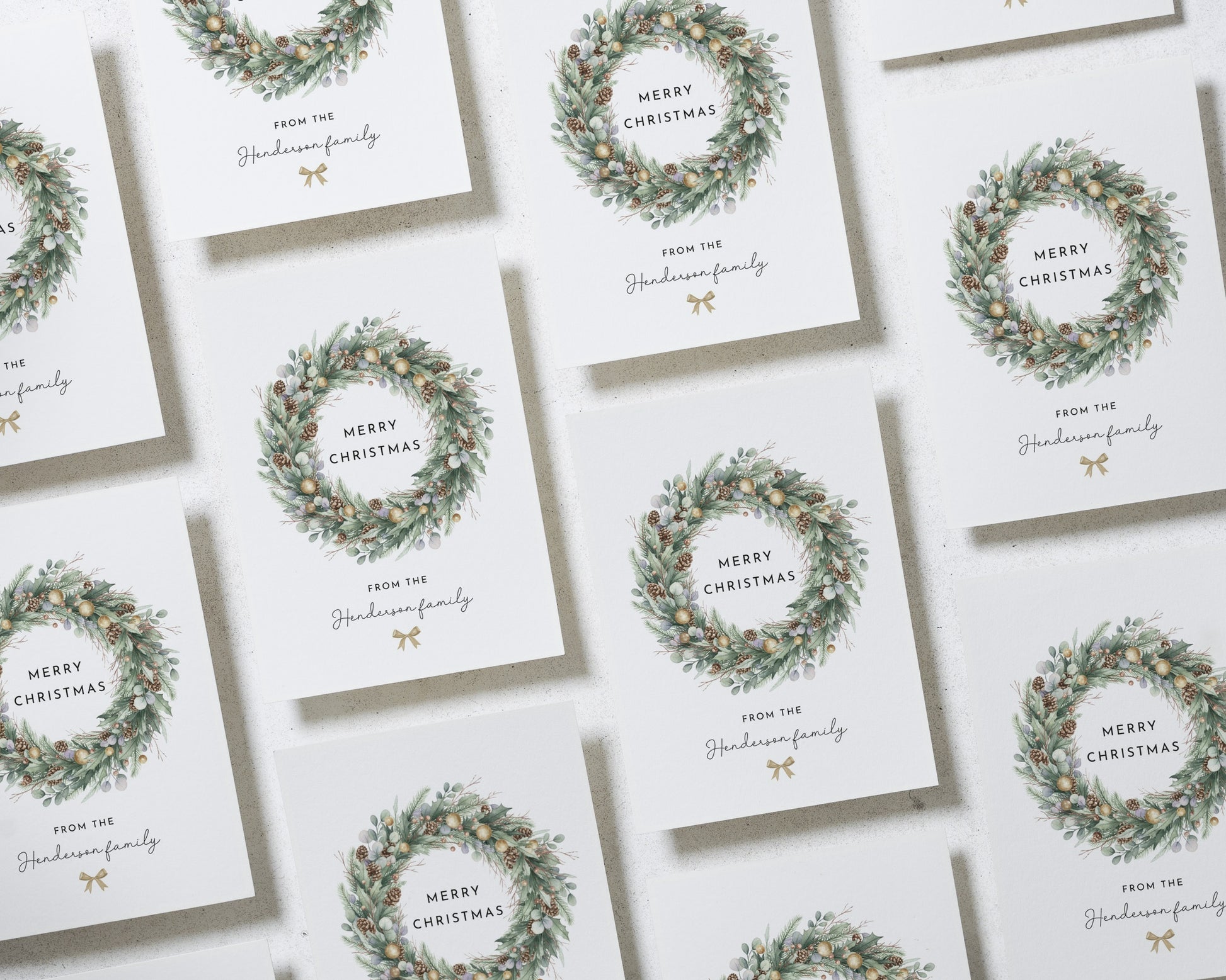 This elegant personalised Christmas card features a festive wreath and custom family name, perfect for sending heartfelt holiday wishes.
