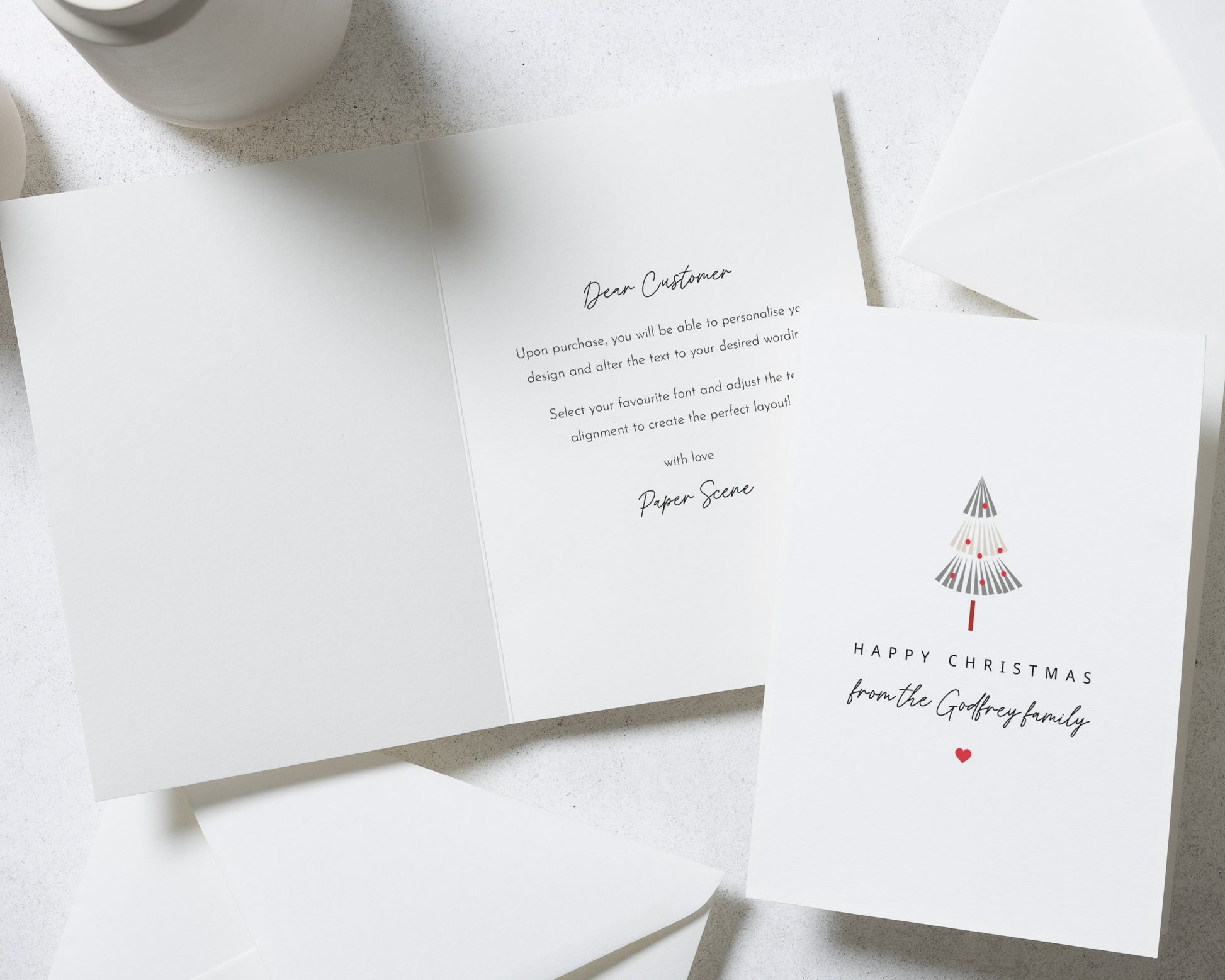 Our Christmas cards are fully personalised to you — including the wording and layout. Our simple, classic templates create a clean and elegant look that feels effortlessly personal.