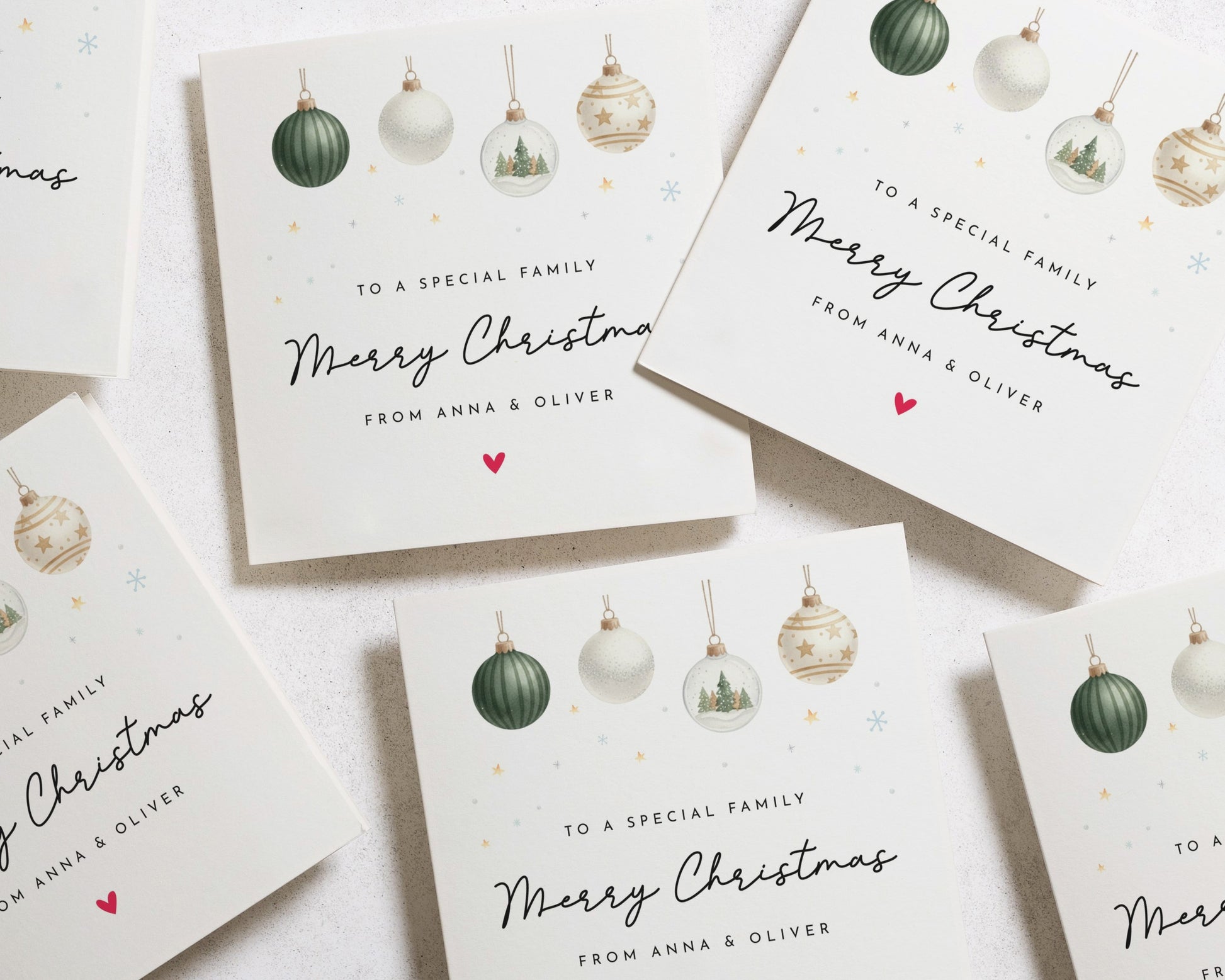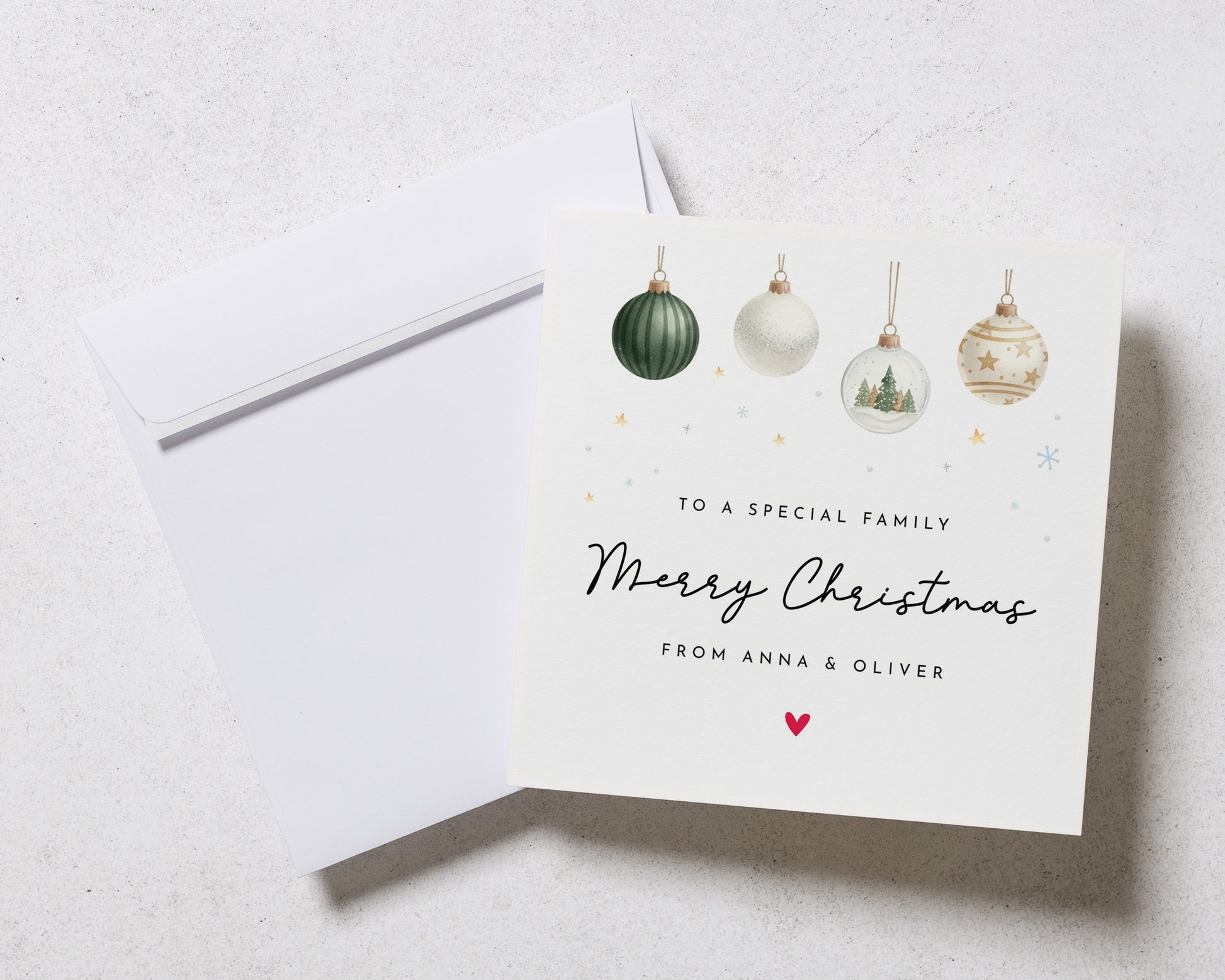 Send festive wishes with this personalised square Christmas card, featuring elegant hanging baubles and space for your custom names.