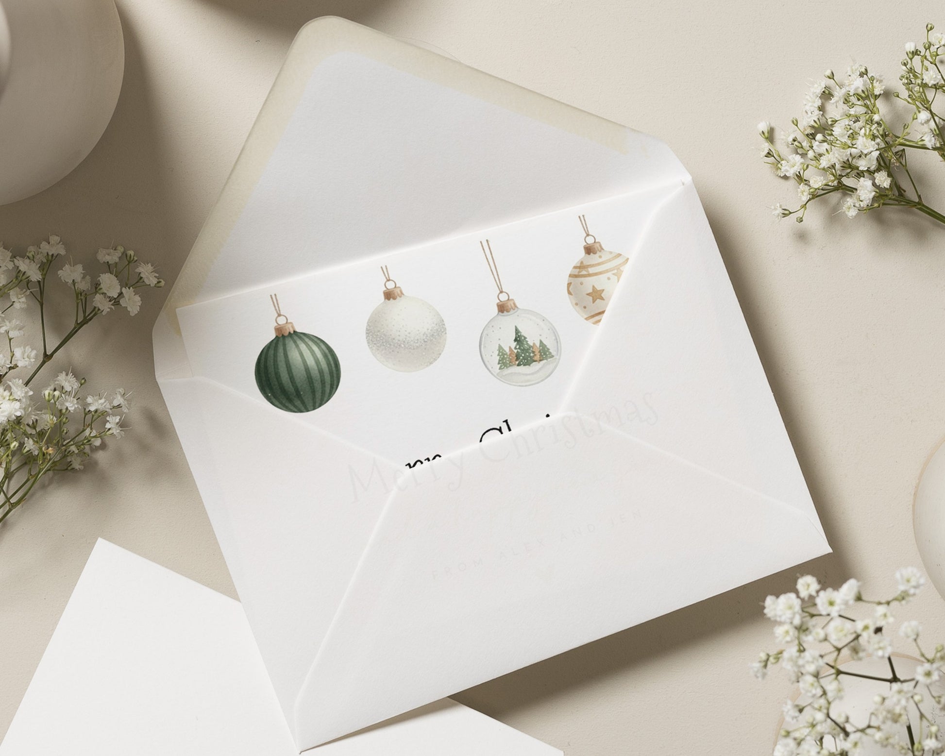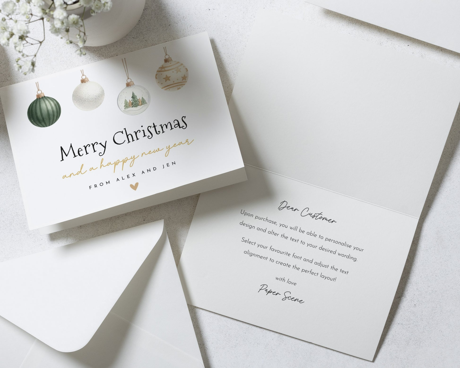 This elegant personalised Christmas card features hand-painted baubles and a custom message from your family. Perfect for sharing festive cheer.